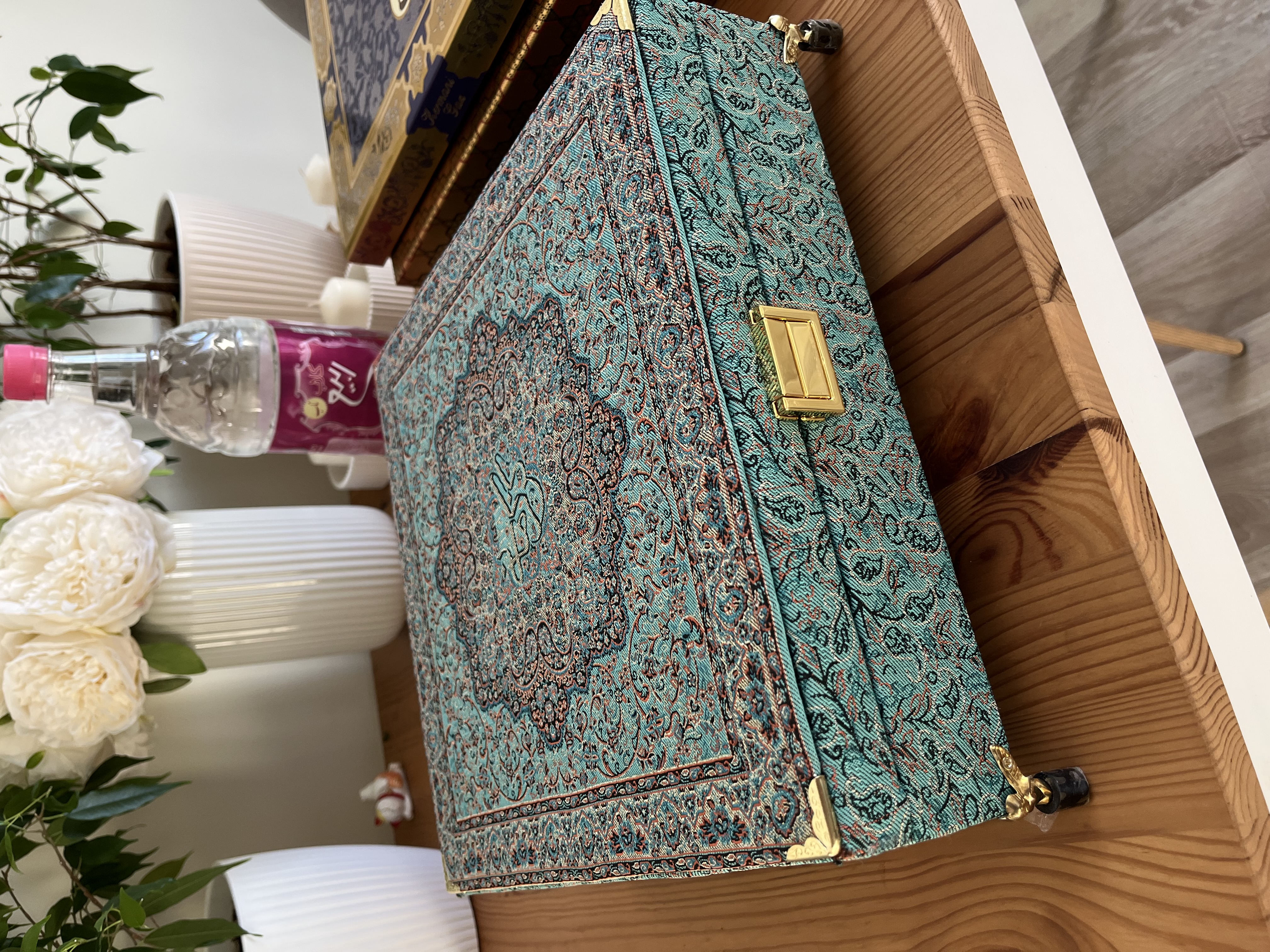 Это роскошь! Не ожидала такого качества! Большая солидная шкатулка, вся фурнитура золоченая. Я бы даже сказала это не шкатулка, а целый саквояж - очень большая. Со всех сторон отделана тканью терме. Внутри сохан и три вида гяза: с миндалем, фисташкой и шафрановой. Невероятно красиво! Выглядит супер роскошно!
