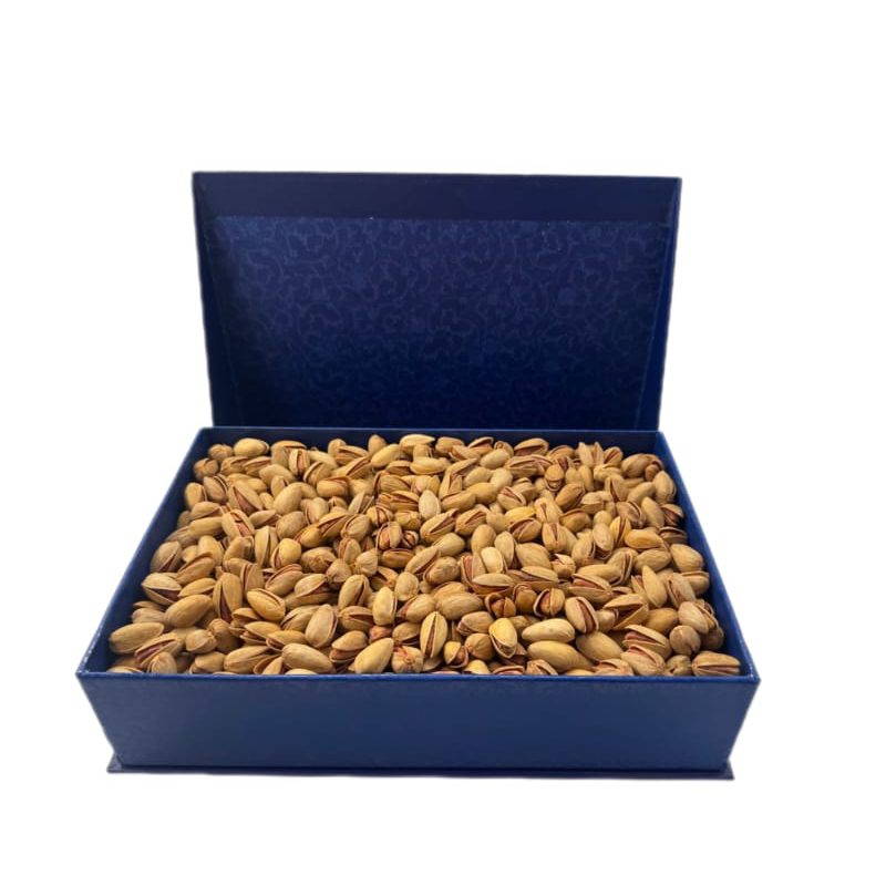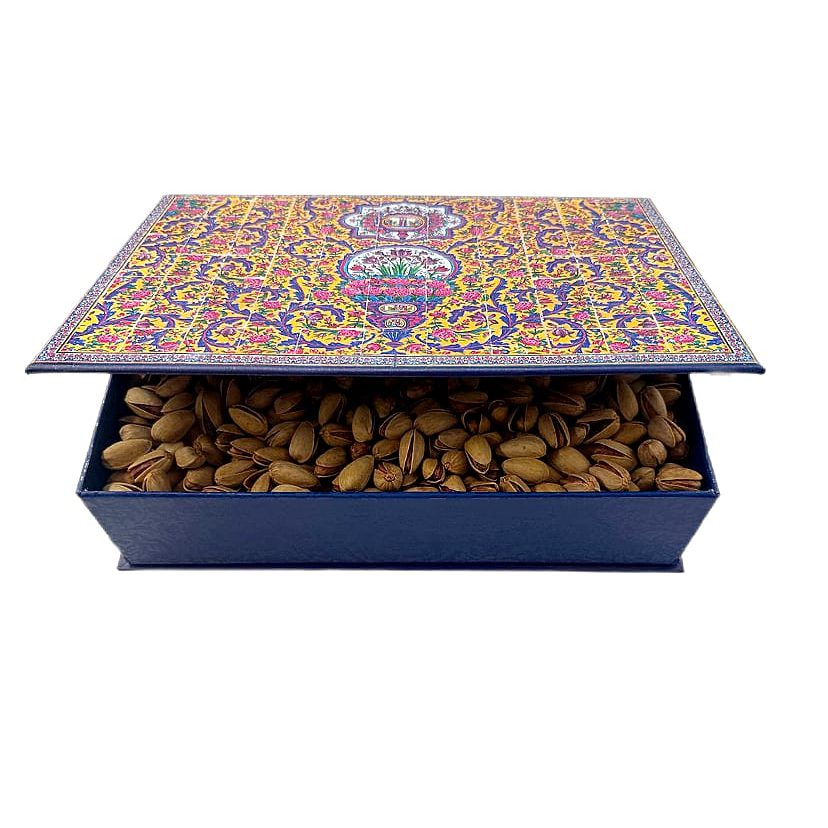 Внутри находятся крупные фисташки из Ирана премиального сорта Akbari — один из самых ценных сортов иранских фисташек, отличающийся вытянутой формой, насыщенным ароматом и мягким ореховым вкусом. Орехи аккуратно обжарены и подготовлены к подаче, благодаря чему сохраняют природную сладость и приятную хрустящую текстуру. Такие иранские фисташки традиционно подают к чаю, используют для угощения гостей или дарят в качестве статусного подарка. Коробка остаётся декоративной шкатулкой и может использоваться повторно для хранения сладостей или мелочей.
