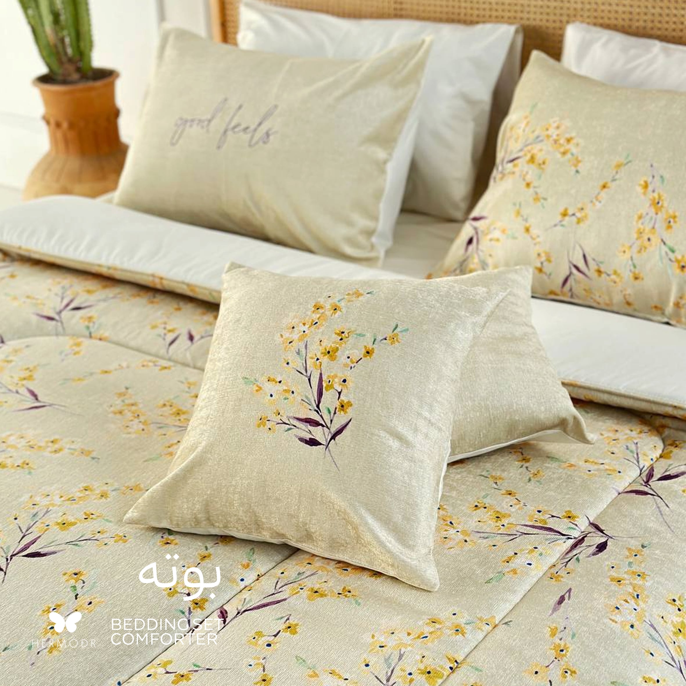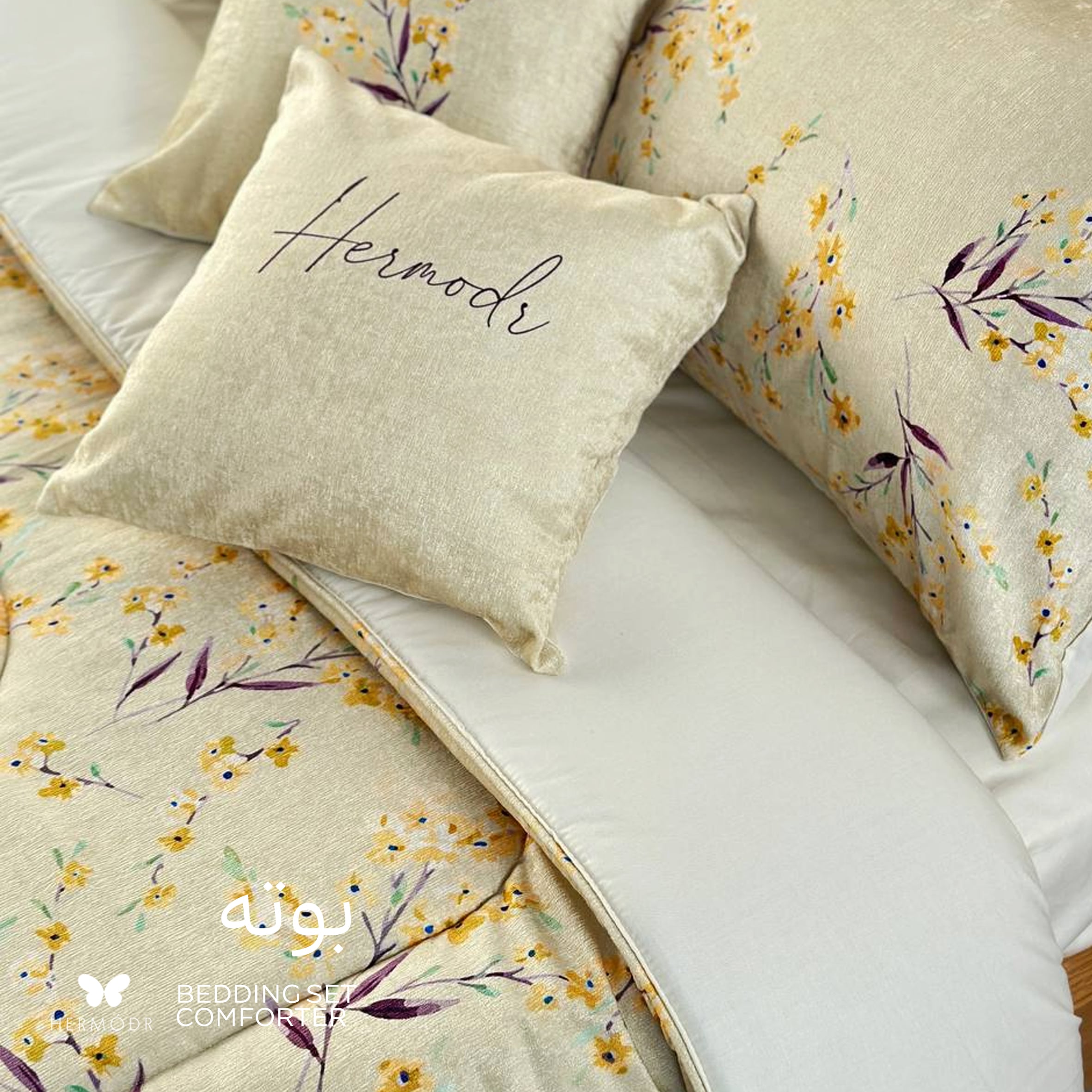 Верх изготовлен из бархата Montreux Velvet — плотного материала с мягким переливом. Внутренняя часть выполнена из дышащих тканей: органического хлопка или brushed-cotton, поэтому комплект комфортен в любое время года. Гипоаллергенный наполнитель с эффектом памяти постепенно расправляется после давления и остаётся воздушным даже после длительного использования. Многослойная простёжка увеличивает срок службы и придаёт изделию аккуратный объёмный вид. Комплект можно использовать как покрывало днём и как одеяло ночью — он рассчитан на ежедневную эксплуатацию.