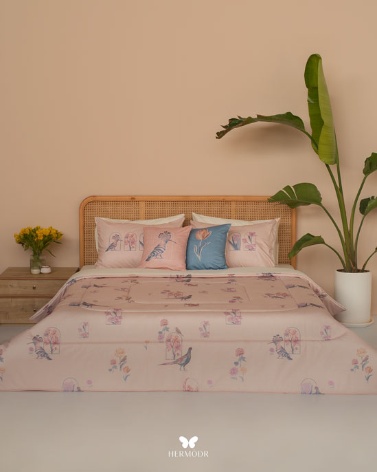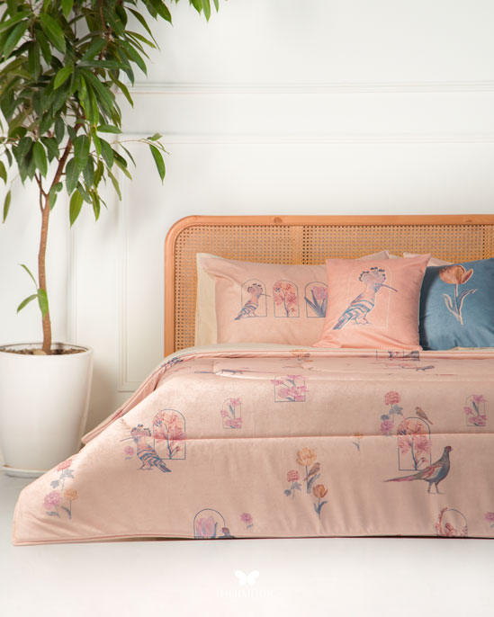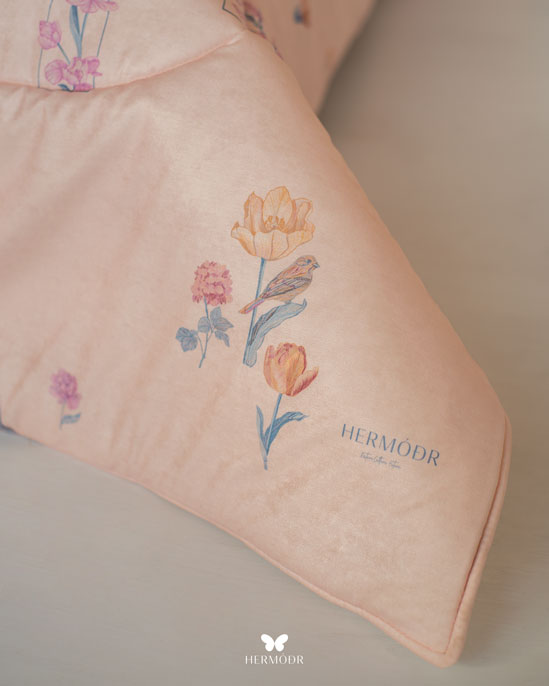 Верх изготовлен из бархата Montreux Velvet — плотного материала с мягким переливом. Внутренняя часть выполнена из дышащих тканей: органического хлопка или brushed-cotton, поэтому комплект комфортен в любое время года. Гипоаллергенный наполнитель с эффектом памяти постепенно расправляется после давления и остаётся воздушным даже после длительного использования. Многослойная простёжка увеличивает срок службы и придаёт изделию аккуратный объёмный вид. Комплект можно использовать как покрывало днём и как одеяло ночью — он рассчитан на ежедневную эксплуатацию.