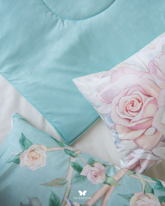 Покрывало выполнено из шелковистого бархата Montreux Velvet — ткань красиво переливается при освещении и визуально напоминает дорогой интерьерный текстиль бутик-отелей. Внутренняя часть изготовлена из органического хлопка или brushed-cotton, благодаря чему комплект дышит и комфортен в любое время года. Наполнитель гипоаллергенный, не накапливает статическое электричество и сохраняет форму после стирок.