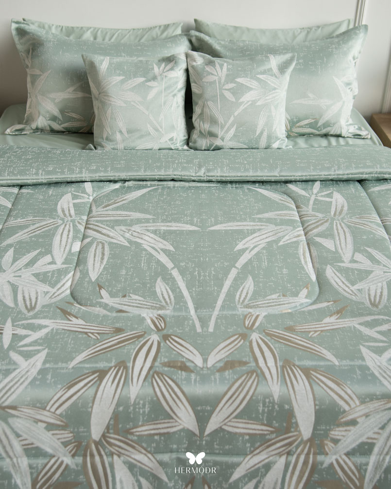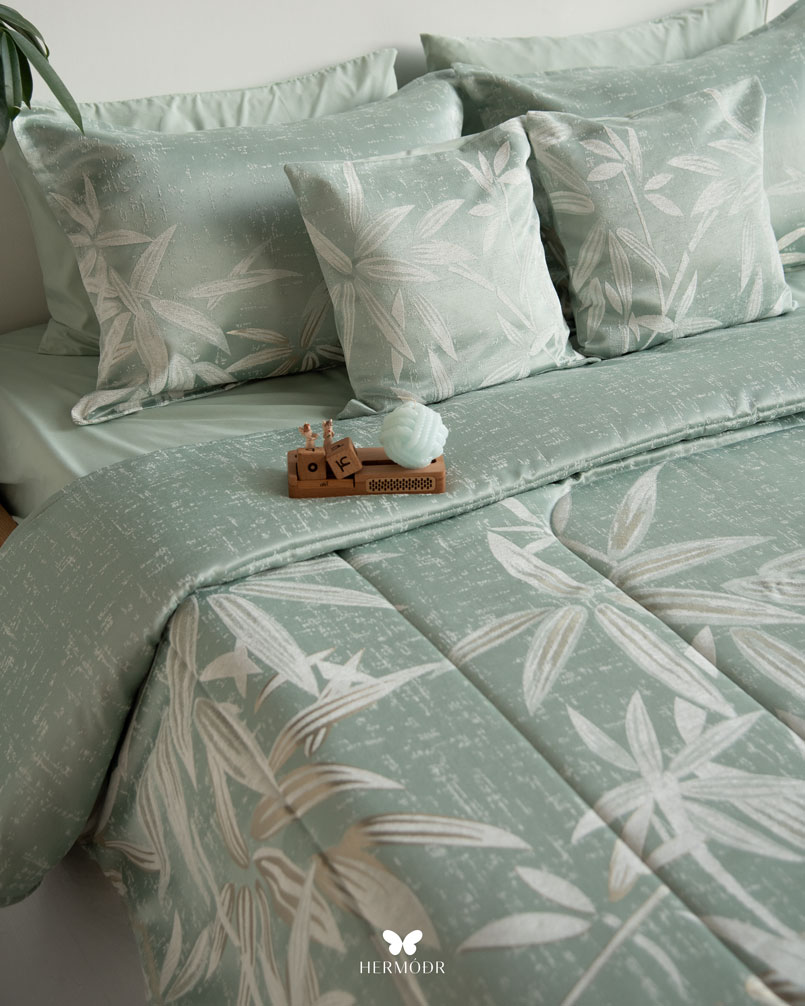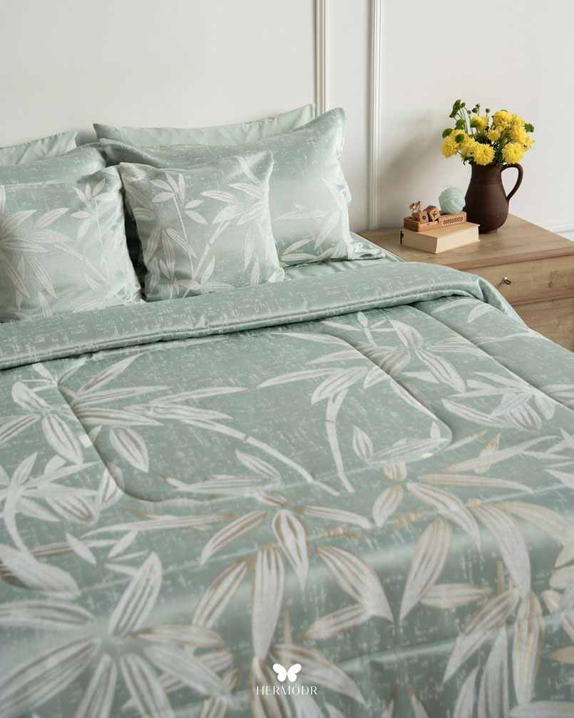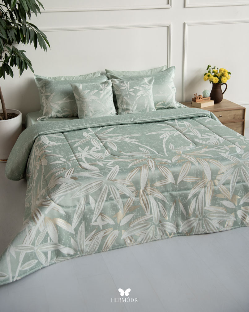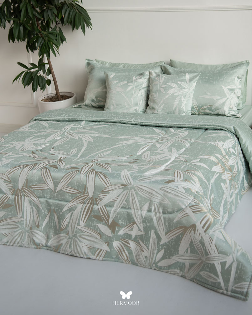 Верх выполнен из бархата Montreux Velvet — плотной ткани с мягким шелковистым переливом. Внутренняя часть изготовлена из органического хлопка или brushed-cotton, поэтому комплект комфортен в любое время года. Гипоаллергенный наполнитель с эффектом памяти сохраняет форму, а многоэтапная простёжка повышает долговечность изделия и предотвращает деформацию. Комплект можно использовать как покрывало днём и как одеяло ночью — он рассчитан на ежедневную эксплуатацию.