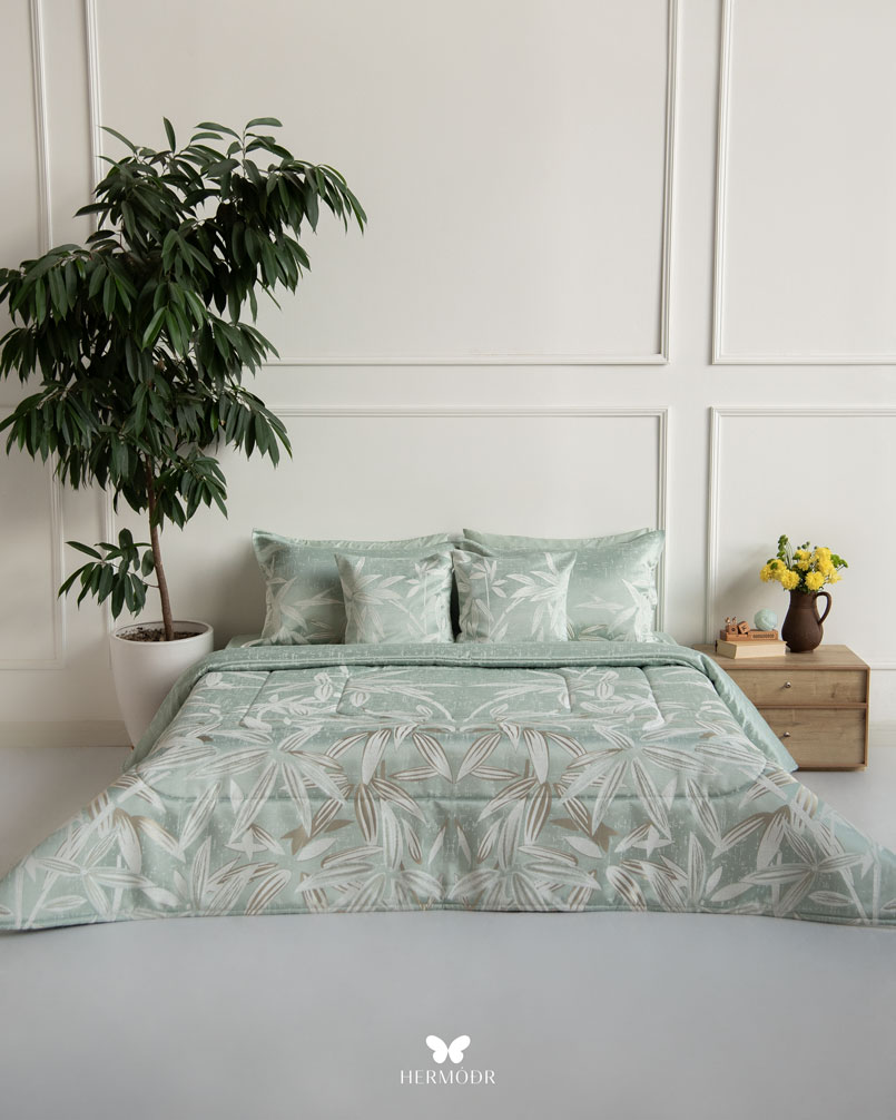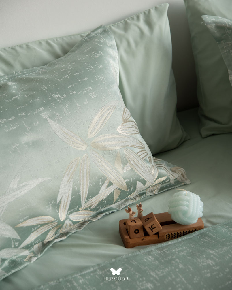 Иранский бархатный комплект постельного белья Shakhe Nabat вдохновлён традиционной персидской миниатюрой: изящные цветочные мотивы с тонким золотистым контуром создают ощущение утончённости и спокойствия в интерьере. Мягкая цветовая палитра делает кровать декоративным акцентом, не перегружая пространство.
