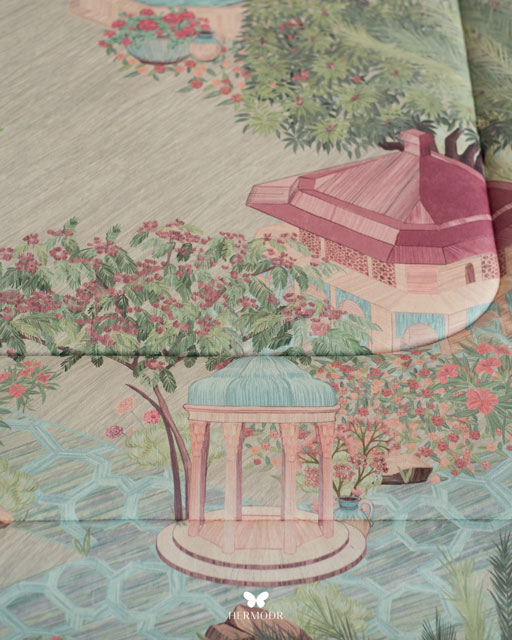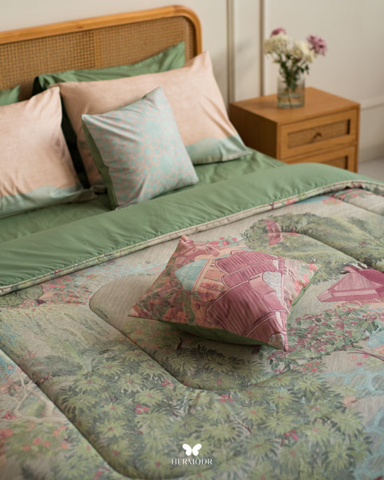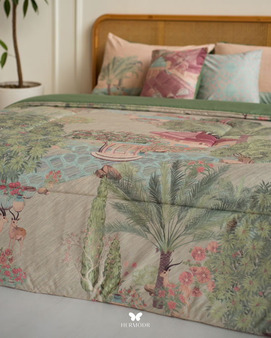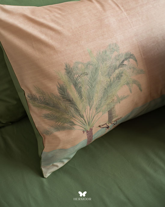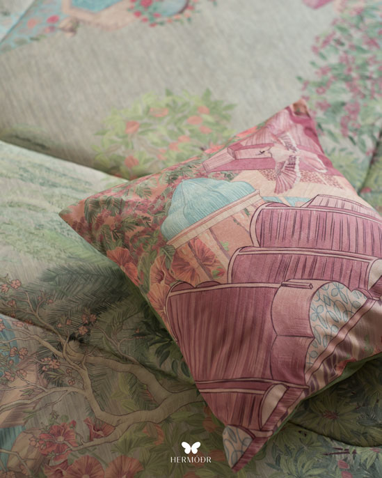 Иранский комплект постельного белья Mehr Gardoon. Комплект вдохновлён традиционным персидским садом — символом гармонии и спокойствия. Орнамент сочетает классические мотивы с современной подачей, поэтому комплект органично смотрится как в классическом, так и в природном интерьере спальни.