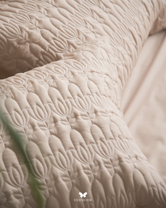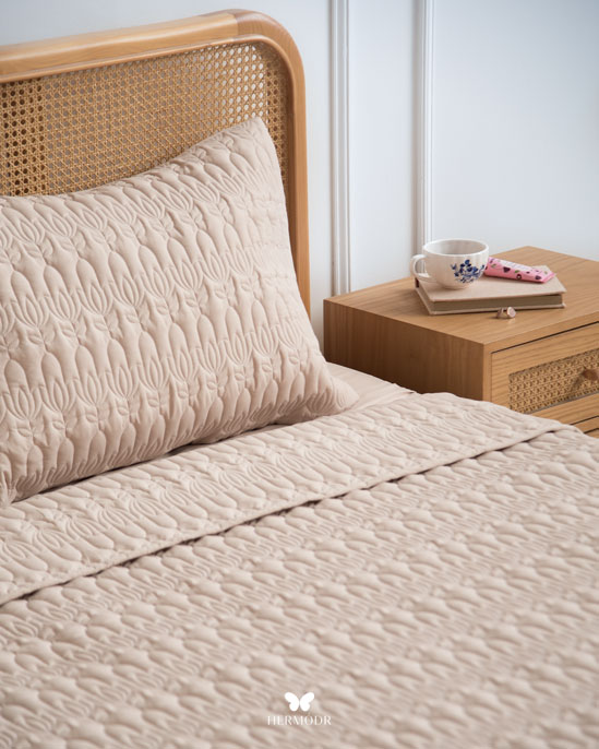 Верх выполнен из сатина-жаккарда — плотной ткани с мягким шелковистым блеском. Внутренняя часть изготовлена из мягкой brushed-ткани, обеспечивающей комфорт во время сна. Комплект рассчитан на круглогодичное использование. Многоэтапная простёжка и частично ручной пошив повышают долговечность изделия и помогают наполнителю сохранять форму. Ткань не линяет и остаётся аккуратной после стирок. Комплект можно использовать как одеяло ночью и как декоративное покрывало днём — он сочетает практичность и интерьерную функцию.