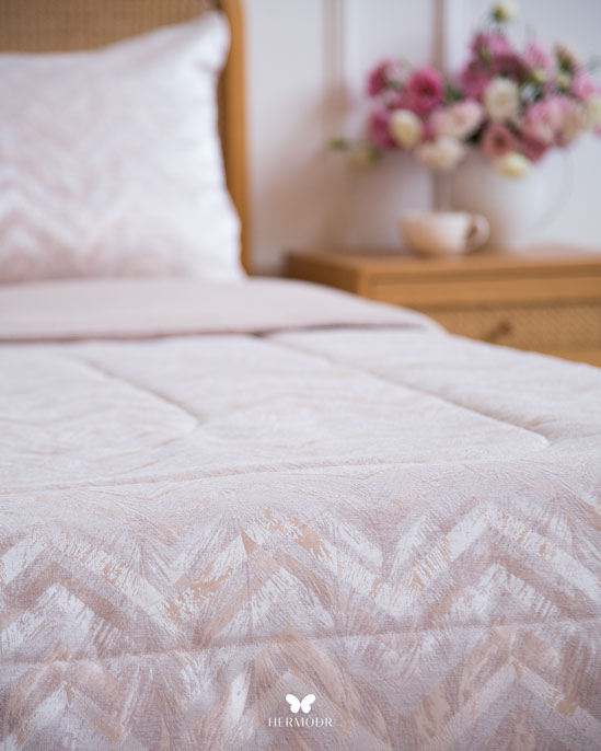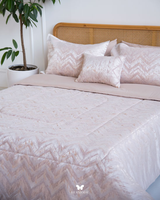 Верх выполнен из сатина-жаккарда — плотной ткани с мягким шелковистым блеском. Внутренняя часть изготовлена из мягкой brushed-ткани, обеспечивающей комфорт во время сна. Комплект рассчитан на круглогодичное использование. Многоэтапная простёжка повышает долговечность изделия и помогает наполнителю сохранять форму. Ткань устойчива к стирке и сохраняет аккуратный внешний вид. Комплект можно использовать как одеяло ночью и как покрывало днём — он сочетает интерьерную эстетику и практичность.