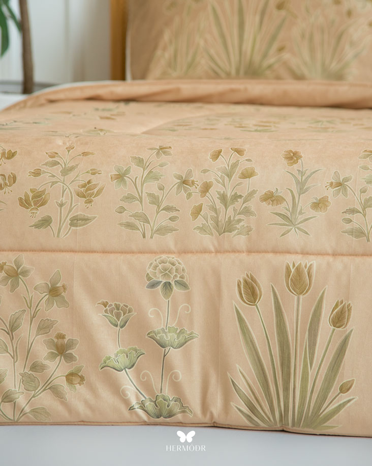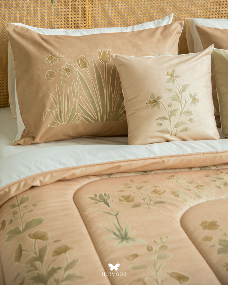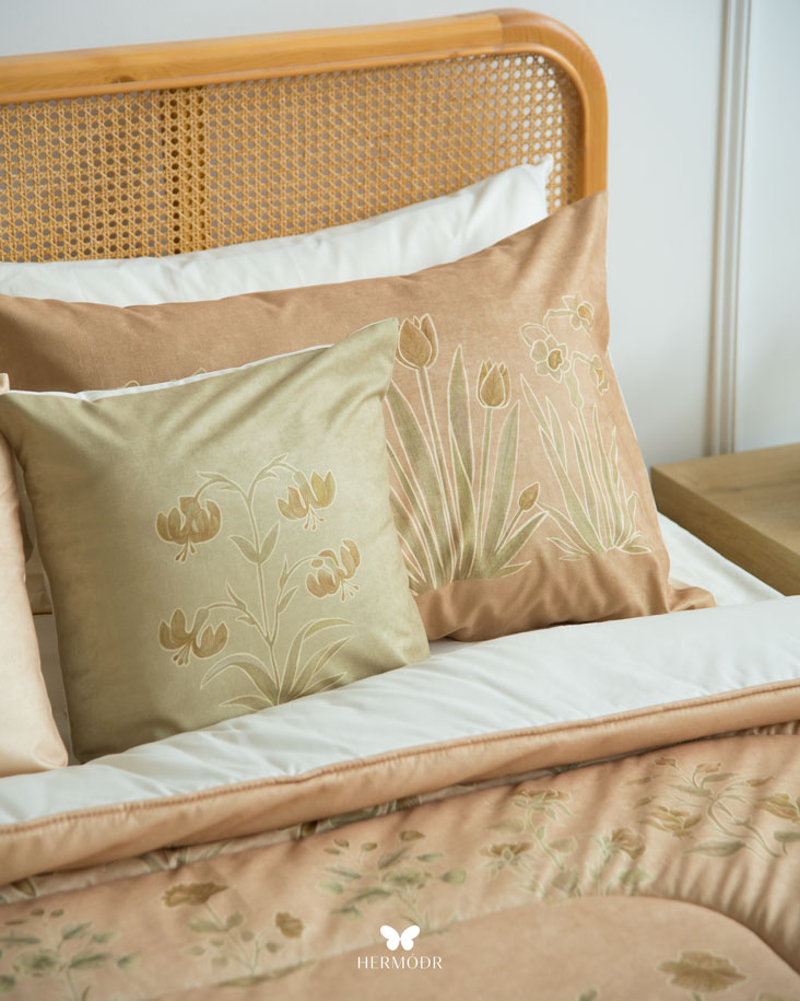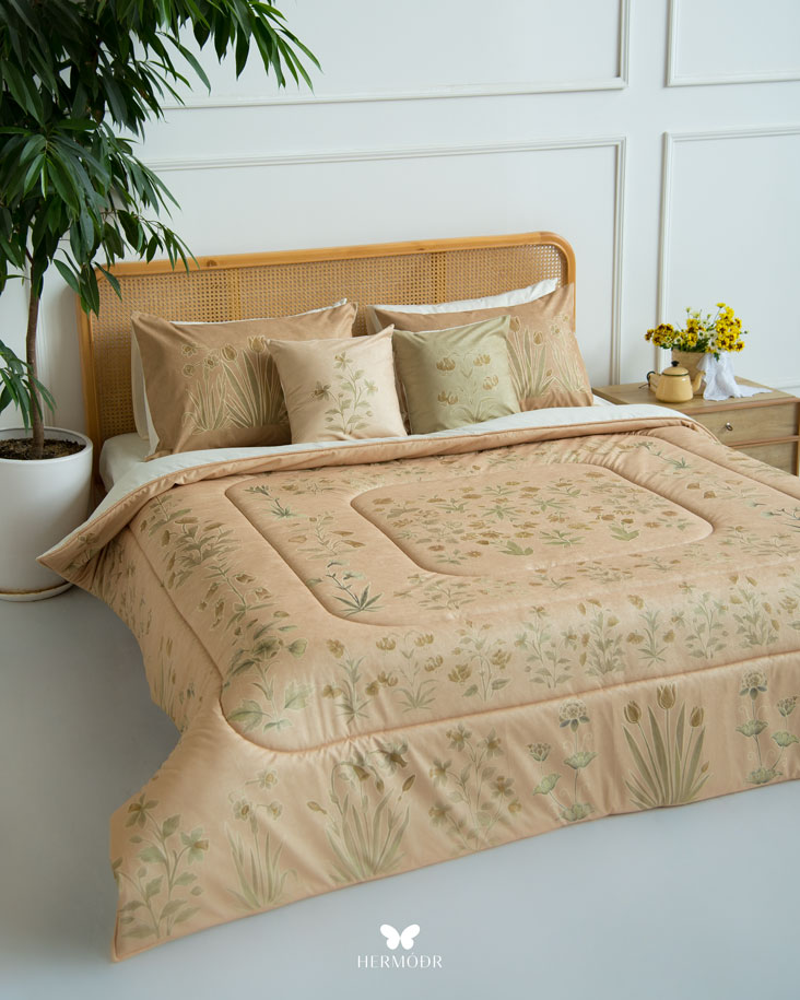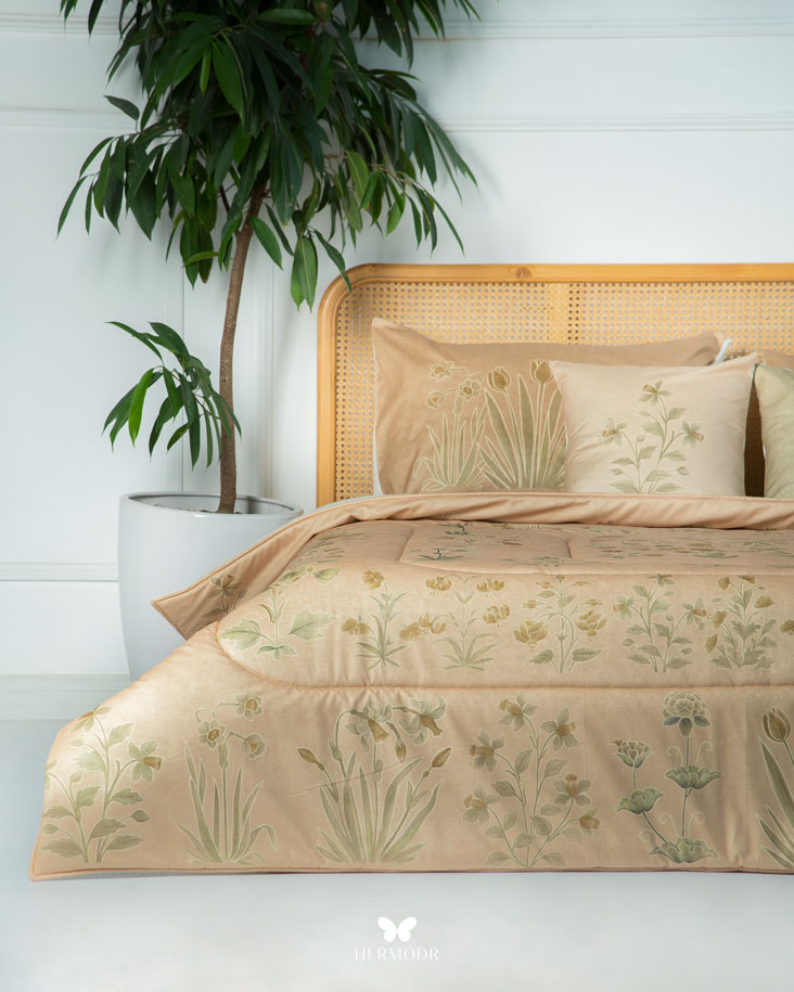 Иранский бархатный комплект постельного белья Shakhe Nabat вдохновлён традиционной персидской миниатюрой: изящные цветочные мотивы с тонким золотистым контуром создают ощущение утончённости и спокойствия в интерьере. Мягкая цветовая палитра делает кровать декоративным акцентом, не перегружая пространство. Верх выполнен из бархата Montreux Velvet — плотной ткани с мягким шелковистым переливом. Внутренняя часть изготовлена из органического хлопка или brushed-cotton, поэтому комплект комфортен в любое время года. Гипоаллергенный наполнитель с эффектом памяти сохраняет форму, а многоэтапная простёжка повышает долговечность изделия и предотвращает деформацию. Комплект можно использовать как покрывало днём и как одеяло ночью — он рассчитан на ежедневную эксплуатацию.