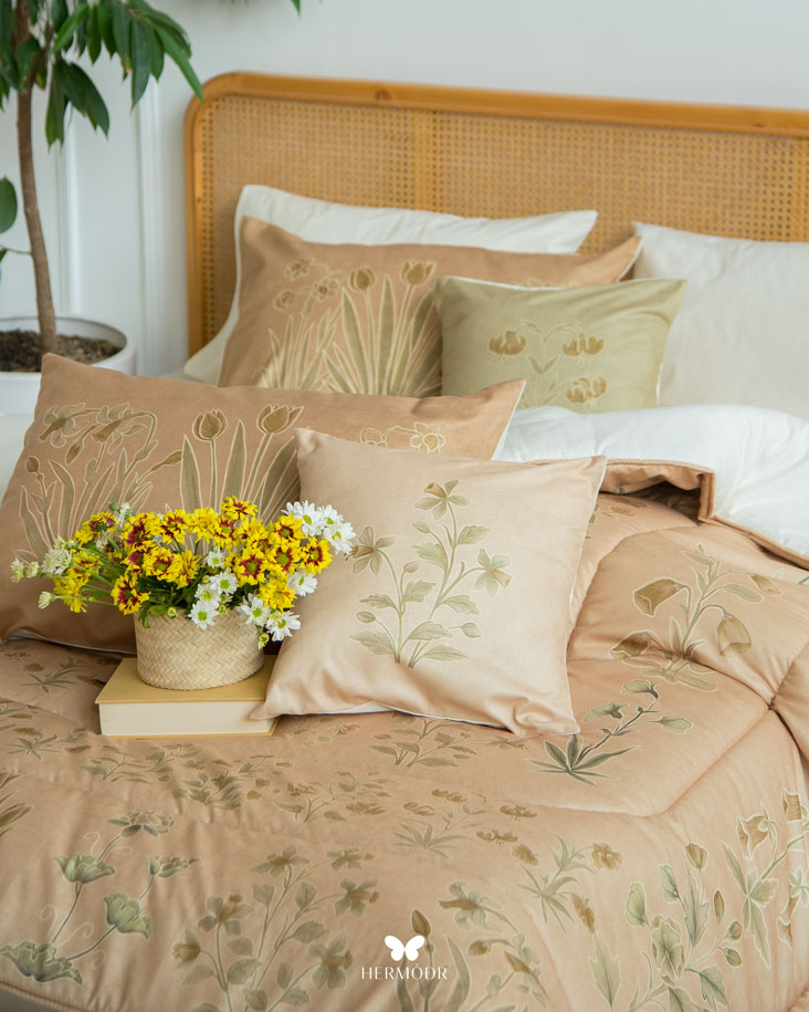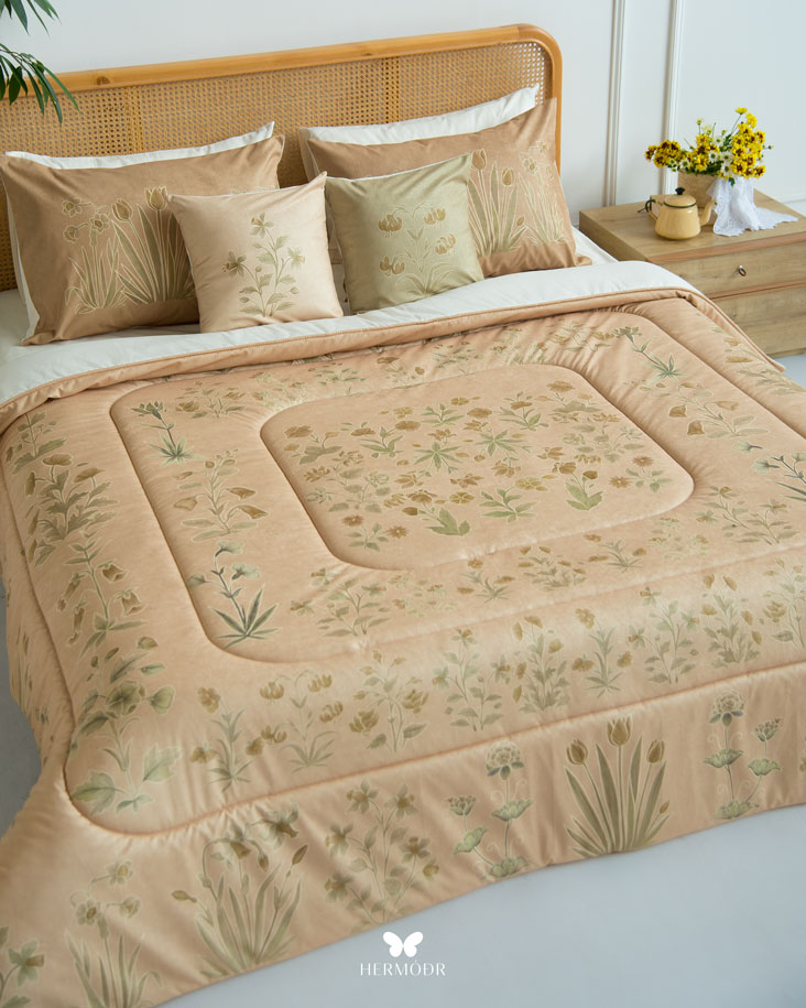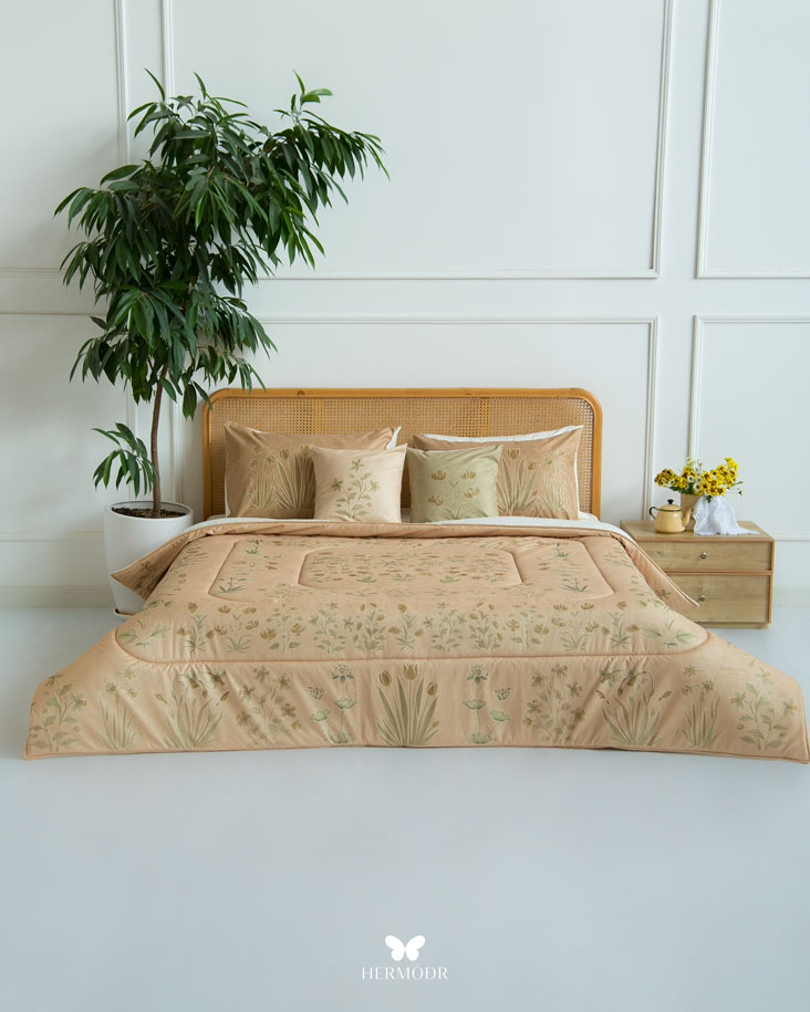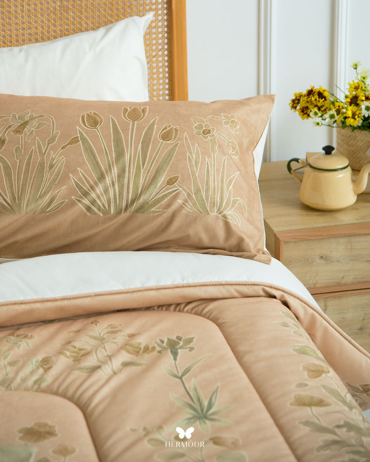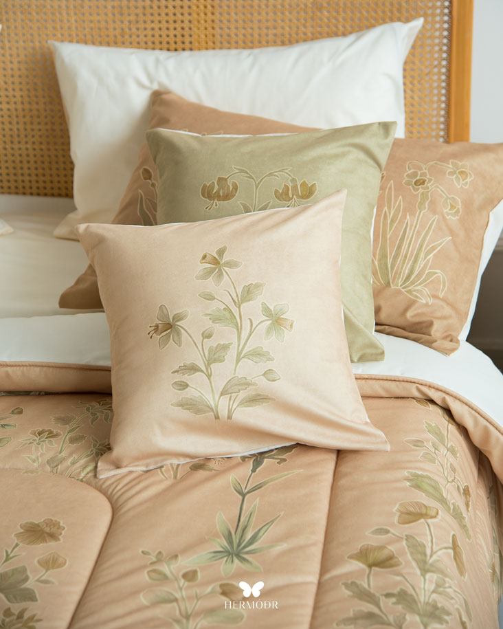 Иранский бархатный комплект постельного белья Shakhe Nabat вдохновлён традиционной персидской миниатюрой: изящные цветочные мотивы с тонким золотистым контуром создают ощущение утончённости и спокойствия в интерьере. Мягкая цветовая палитра делает кровать декоративным акцентом, не перегружая пространство. Верх выполнен из бархата Montreux Velvet — плотной ткани с мягким шелковистым переливом. Внутренняя часть изготовлена из органического хлопка или brushed-cotton, поэтому комплект комфортен в любое время года. Гипоаллергенный наполнитель с эффектом памяти сохраняет форму, а многоэтапная простёжка повышает долговечность изделия и предотвращает деформацию. Комплект можно использовать как покрывало днём и как одеяло ночью — он рассчитан на ежедневную эксплуатацию.