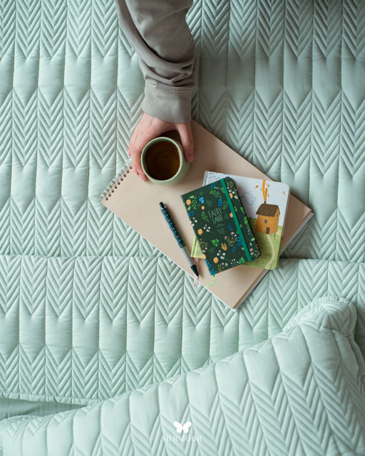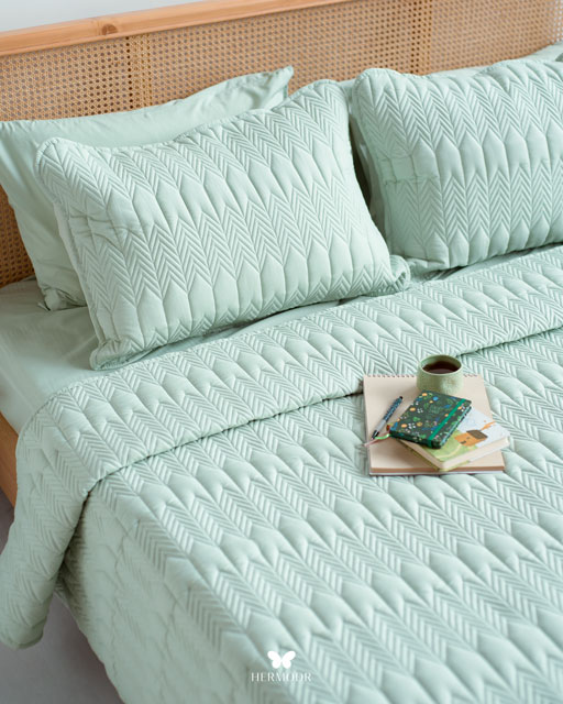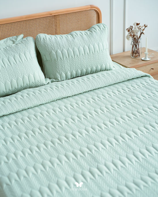 Лаконичный комплект с природным характером — глубокий зелёный оттенок и спокойный рисунок напоминают хвойный лес и создают ощущение свежести в спальне. Подходит для светлых и природных интерьеров, где важна лёгкость и ощущение воздуха.