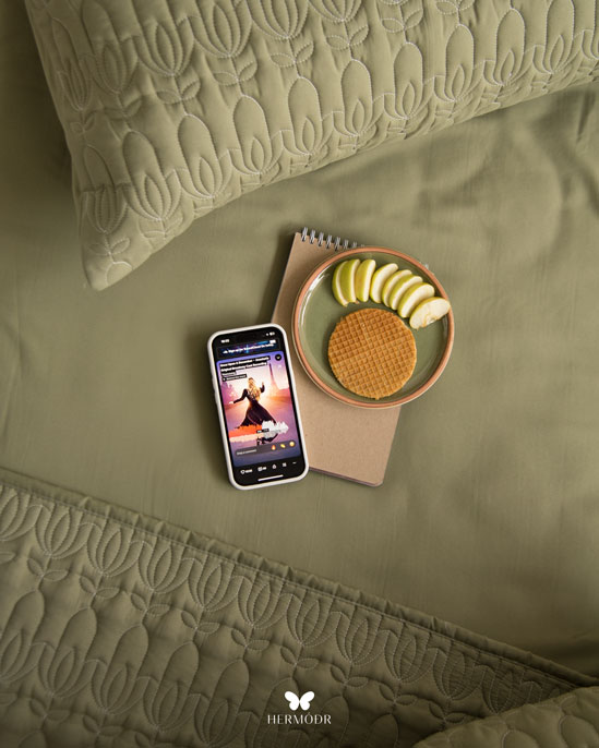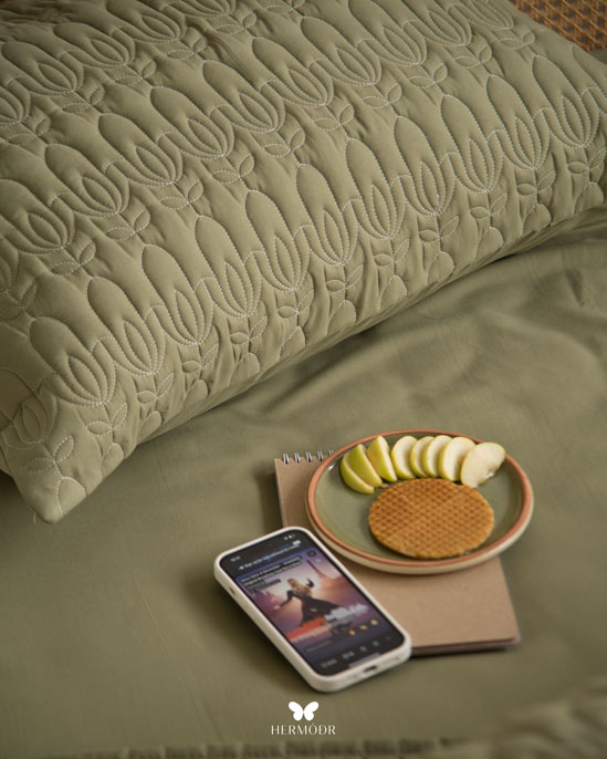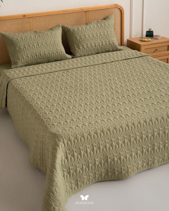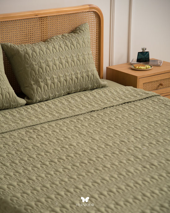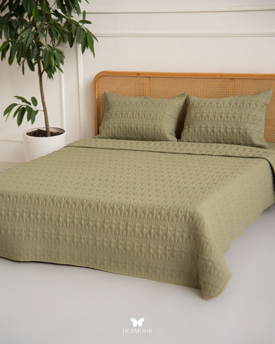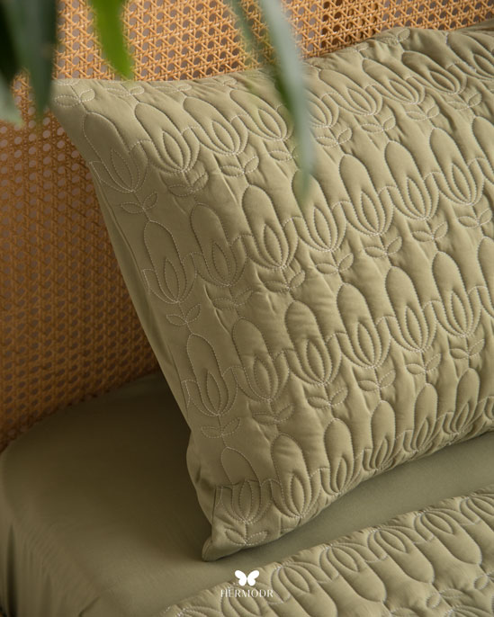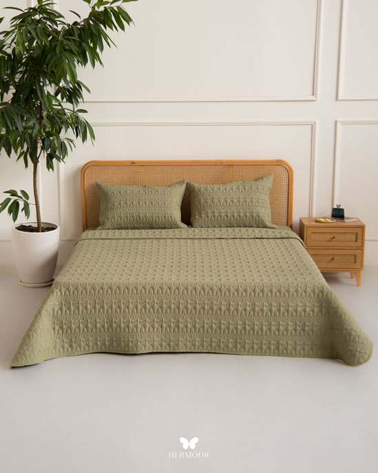 Иранский комплект покрывала и наволочек Lalehzar Green в спокойном зелёном оттенке с мягким природным рисунком. Ткань создаёт ощущение свежести и делает спальню более «воздушной», поэтому особенно хорошо подходит для светлых интерьеров.
