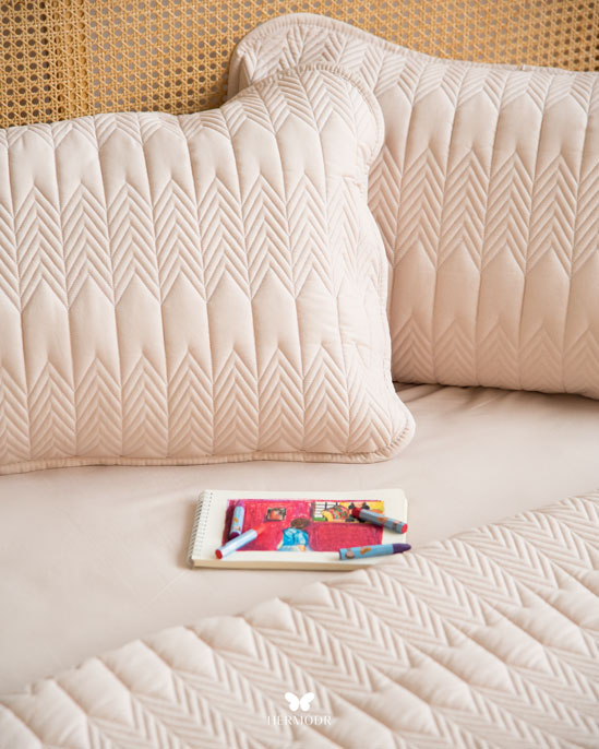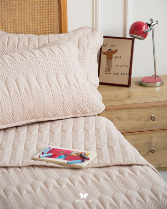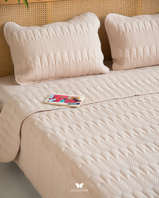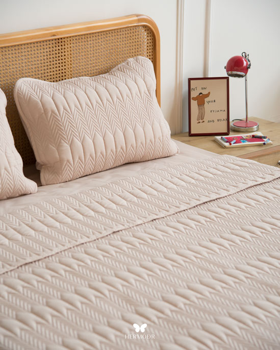 Иранский лёгкий комплект покрывала Kaj Nescafe Brown в оттенке тёплого кофе с молоком создаёт уютную и спокойную атмосферу спальни. Нейтральный цвет легко сочетается с большинством интерьеров и подходит для повседневного использования.