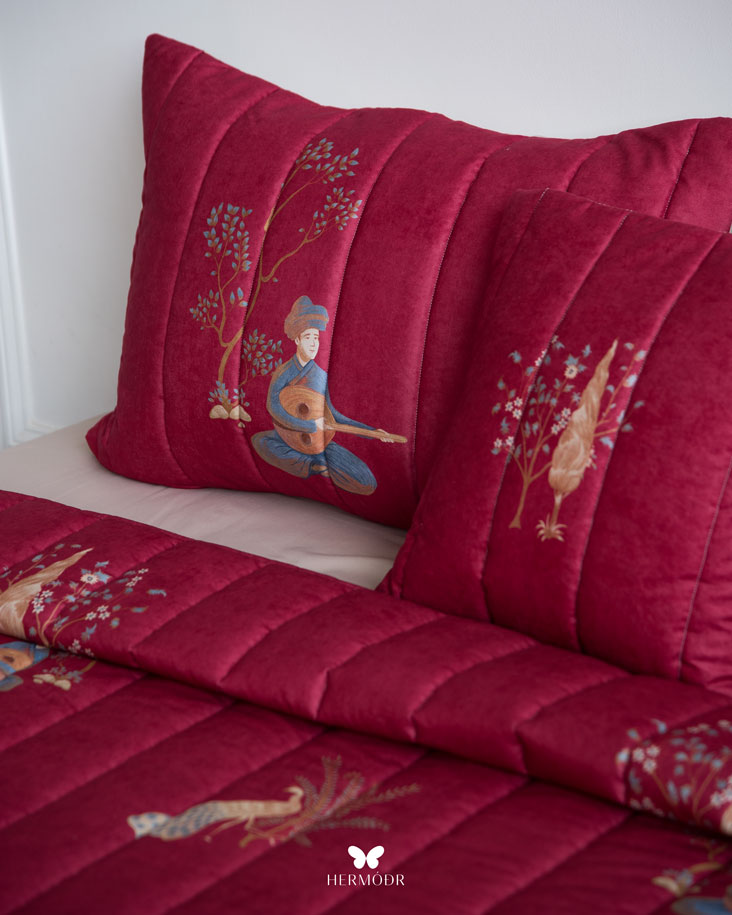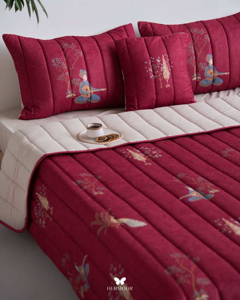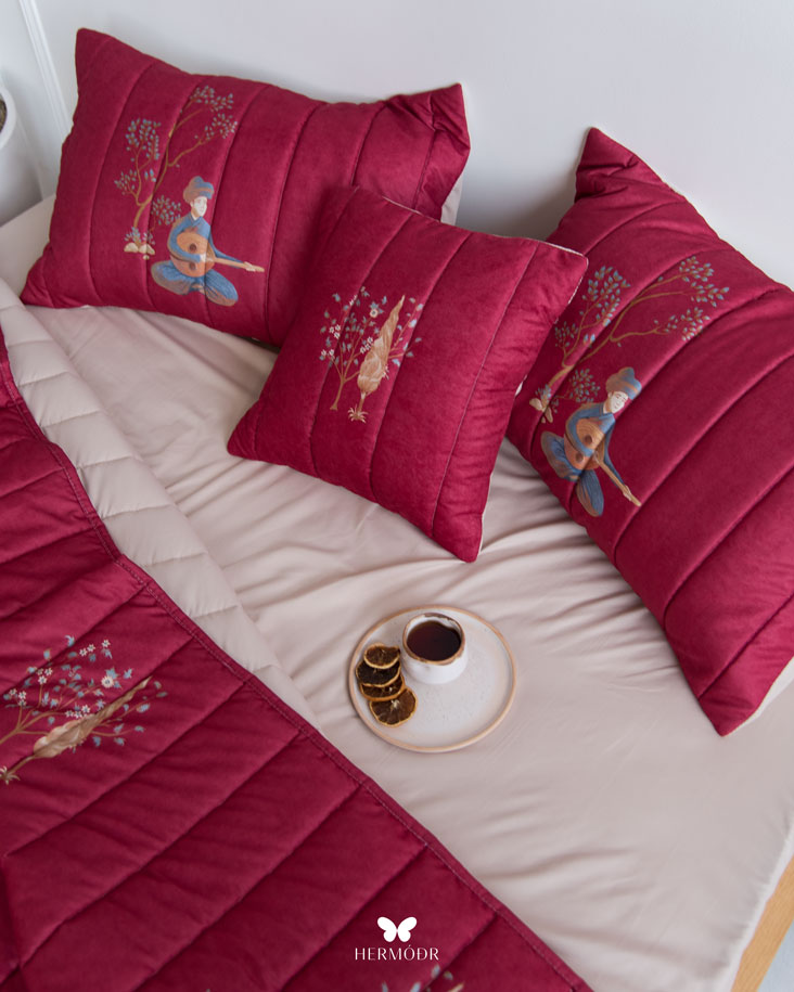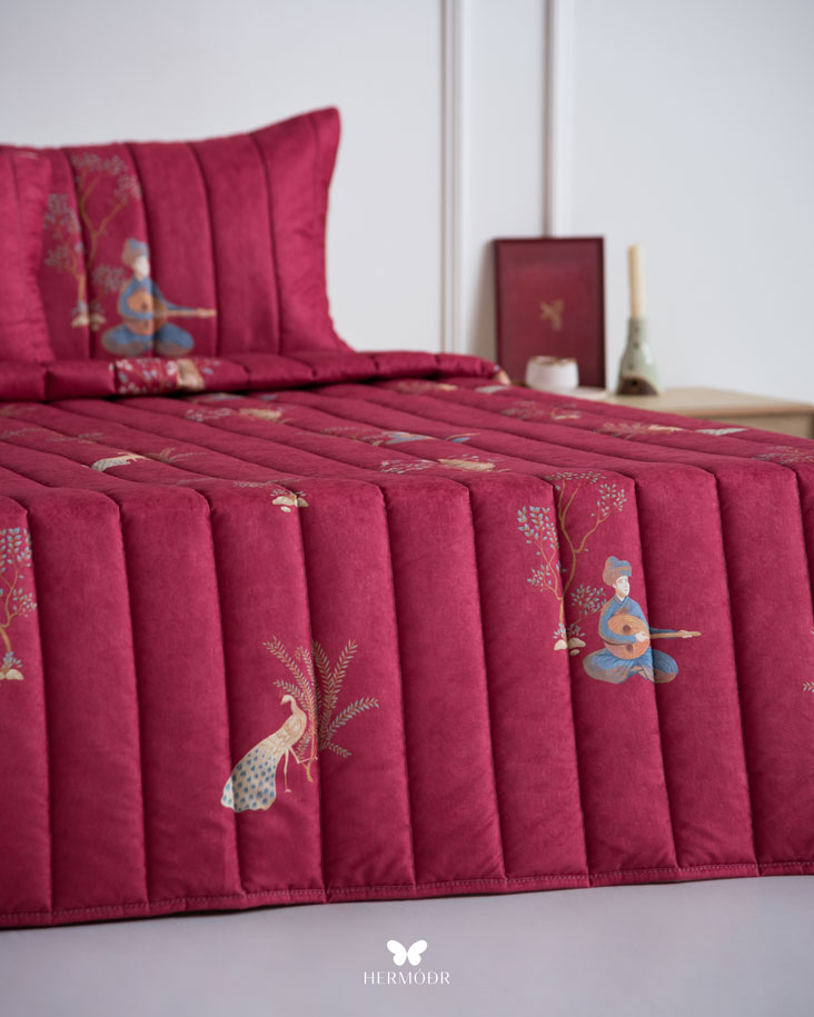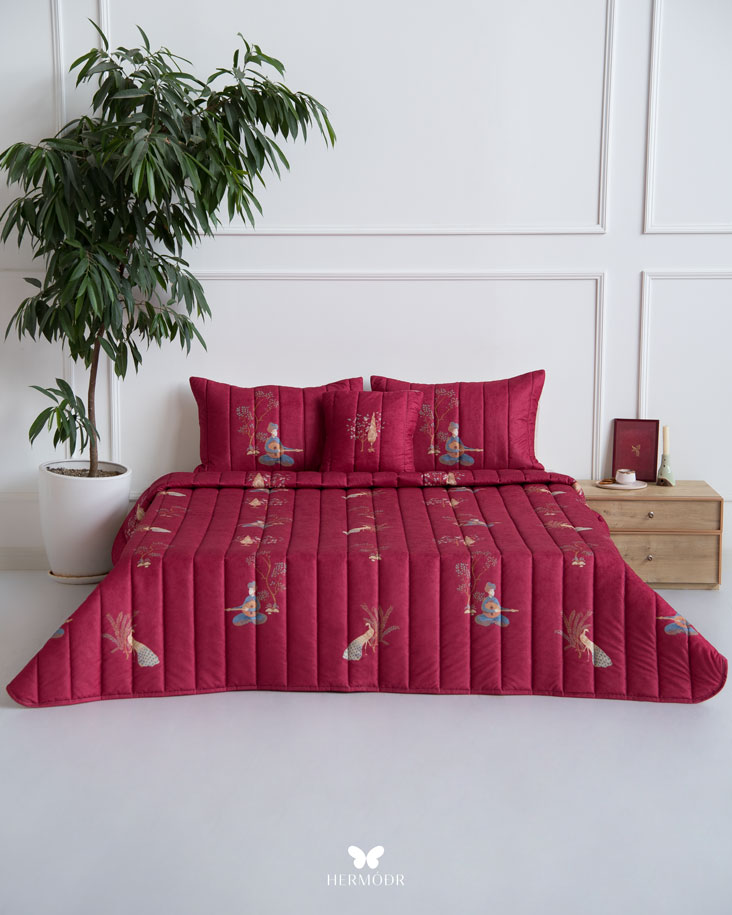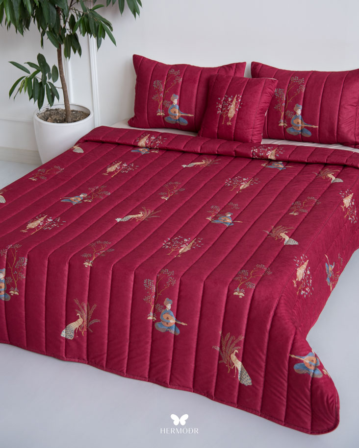 Иранский комплект стеганного покрывала и подушек Chang va Ood Navy выполнен в глубокем тёмно-синем оттенке с художественным восточным орнаментом. Он создаёт спокойную атмосферу спальни и добавляет интерьеру выразительность без перегруженности.