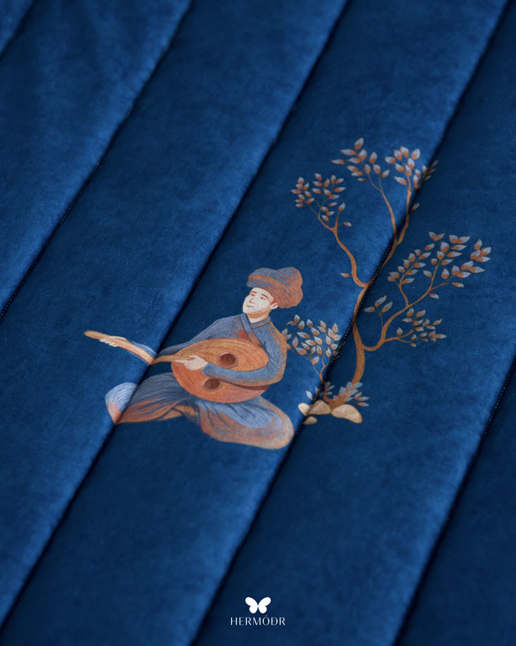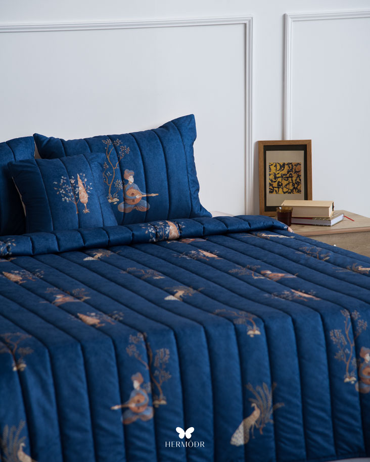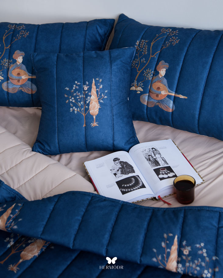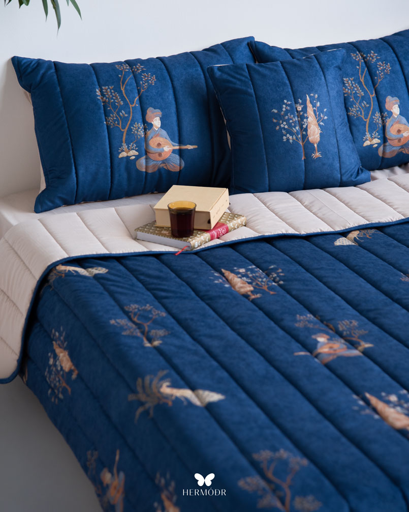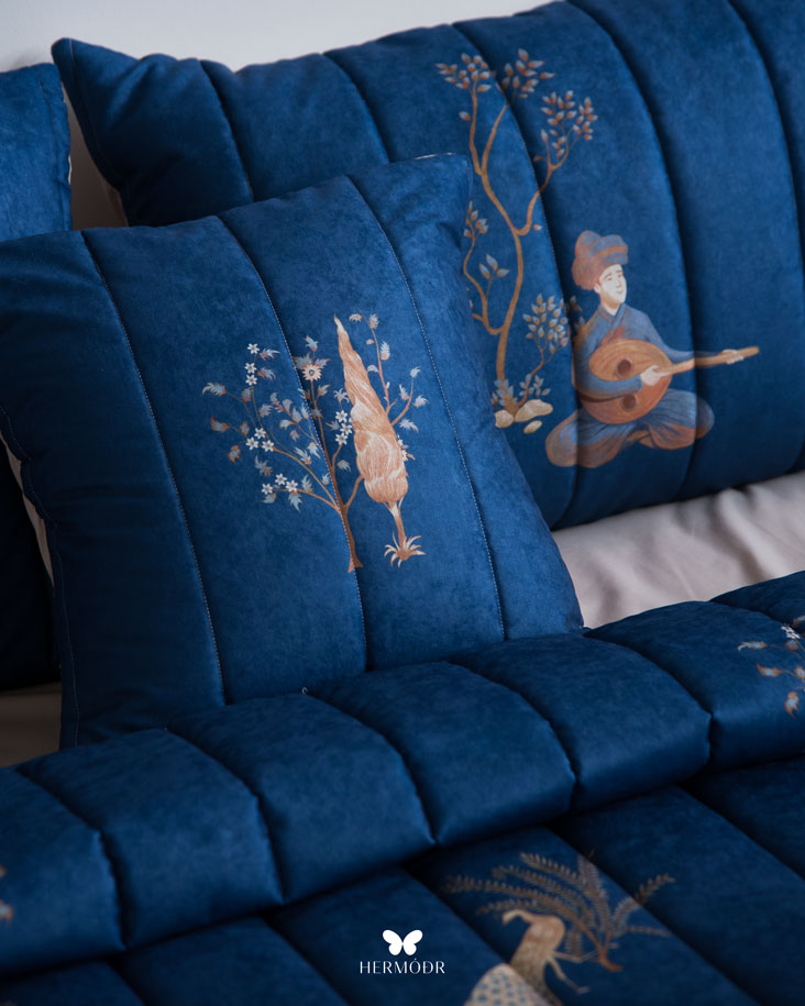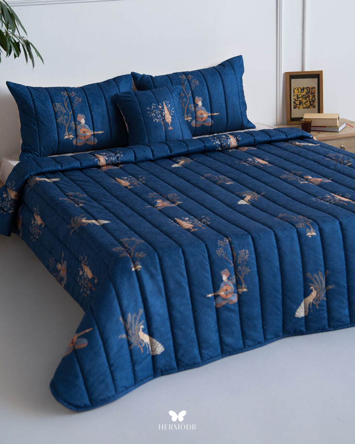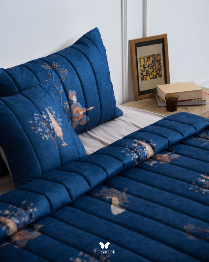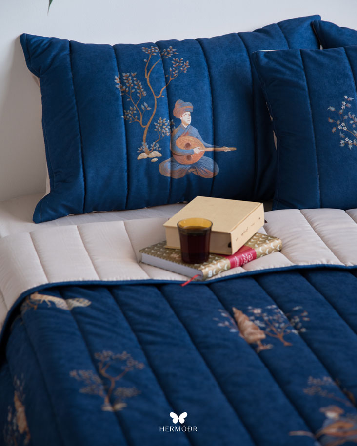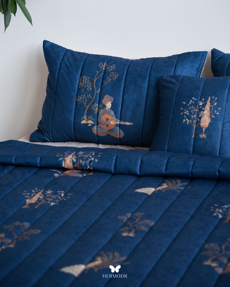 Иранский комплект стеганного покрывала и подушек Chang va Ood Navy выполнен в глубокем тёмно-синем оттенке с художественным восточным орнаментом. Он создаёт спокойную атмосферу спальни и добавляет интерьеру выразительность без перегруженности.