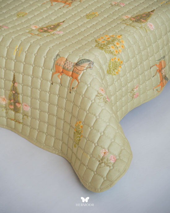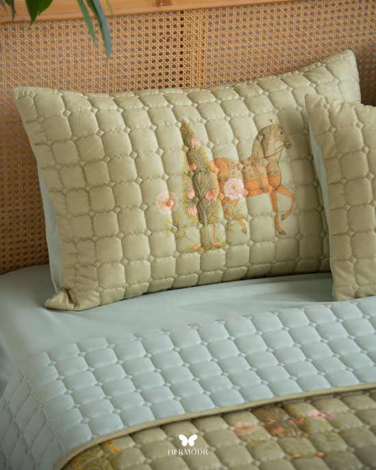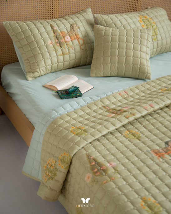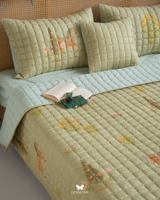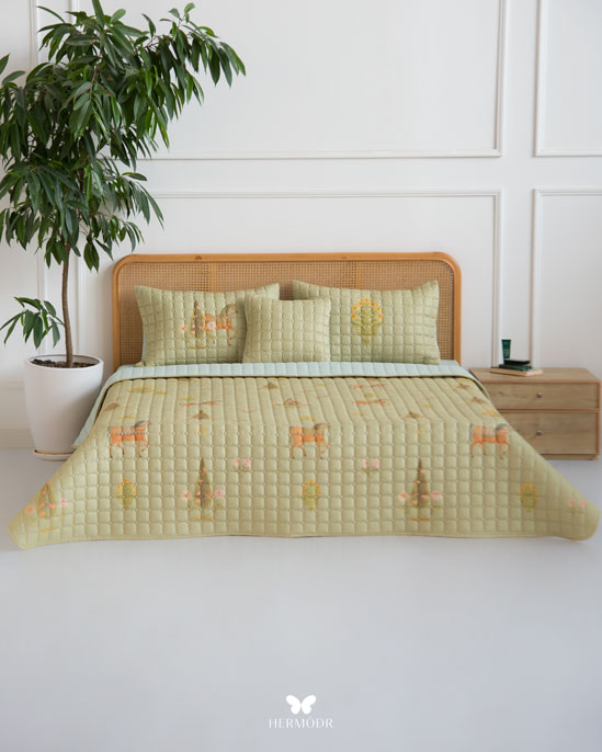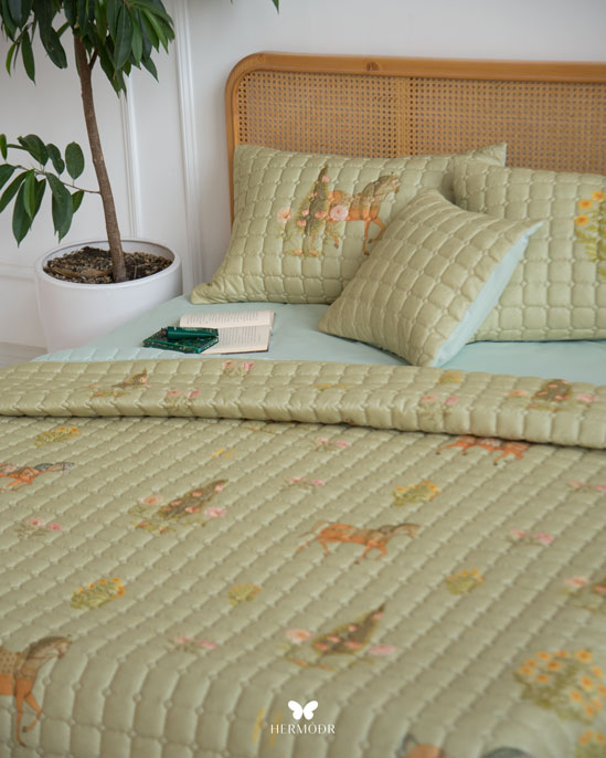 Иранский комплект покрывала и наволочек Soufiyan Matcha Green выполнен в спокойном оттенке зелёной матча — мягком и расслабляющем цвете, который визуально «охлаждает» интерьер и создаёт ощущение свежести в спальне.