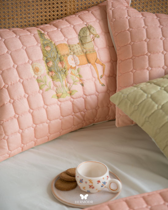 Иранский комплект покрывала и наволочек Soufiyan Navy Blue выполнен в спокойном голубом, мягком и расслабляющем цвете, который визуально «охлаждает» интерьер и создаёт ощущение свежести в спальне.