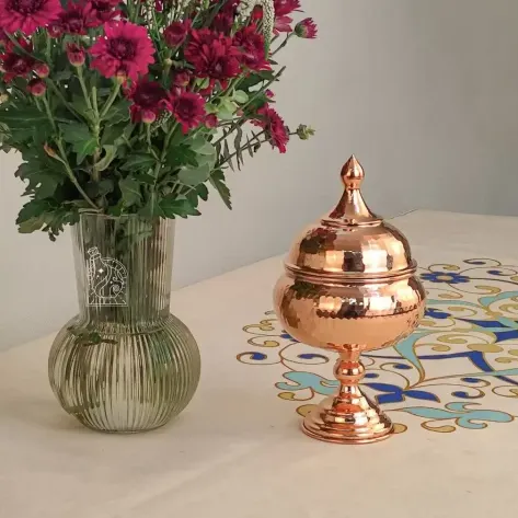 Медная ваза-конфетница — это больше чем просто посуда, это частичка подлинной Персии у вас дома. Изделие выполнено вручную из качественной меди. Благодаря удобной форме и крышке ваза сохраняет свежесть сладостей и орехов, защищает их от пыли и посторонних запахов. Предмет прекрасно подходит для сервировки чая, украшения интерьера в восточном стиле или в качестве статусного подарка ценителям ручной работы.