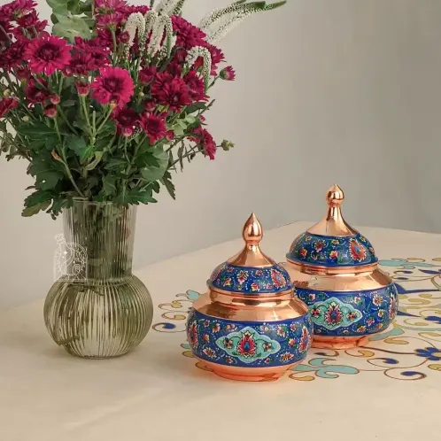 Медная сахарница, выполненная в лучших традициях иранских мастеров. Корпус изделия изготовлен из чистой меди и украшен яркой художественной росписью в технике персидской эмали. Глубокий синий фон, тонкие цветочные орнаменты и аккуратные золотистые линии создают ощущение восточной роскоши и делают предмет настоящим украшением стола.