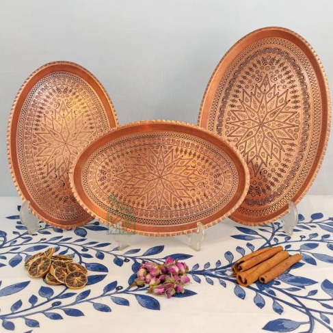 Перед вами изысканное медное блюдо овальной формы — предмет, в котором соединились древние иранские традиции и безупречное мастерство ремесленников. Поверхность украшена тонкой художественной гравировкой с мотивом восточной звезды и цветочного орнамента. Каждая линия выполнена вручную, поэтому узор «дышит» и выглядит живым, а не фабричным.
