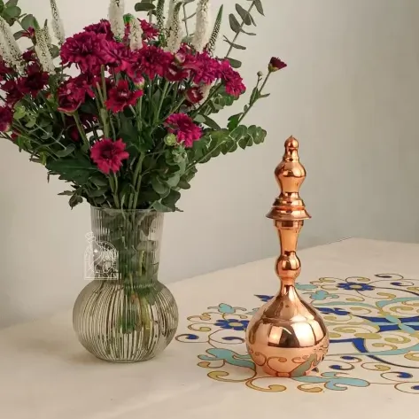 Изящный медный кувшин с узким горлом, созданный специально для хранения и подачи розовой воды. Тонкий вытянутый силуэт и благородный блеск меди отсылают к классическим иранским формам — таким кувшинам веками отводилась особая роль в быту и ритуалах Востока.