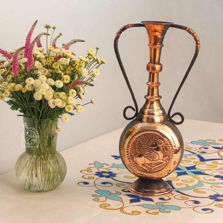 Медный кувшин ручной работы — предмет, в котором соединились традиции восточного ремесла и выразительный художественный образ. Форма сосуда вытянутая и благородная: высокая горловина, устойчивое основание и две тонкие изогнутые ручки придают ему сходство с антикварными персидскими амфорами. Особое украшение кувшина — рельефное панно на корпусе с сюжетным изображением, выполненное в технике чеканки. Теплый блеск меди и благородные патинированные детали делают изделие настоящим арт-объектом.