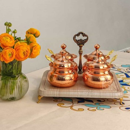 Медный набор для специй — яркий пример того, как функциональная кухонная утварь превращается в выразительный элемент сервировки. Четыре аккуратные баночки с крышечками и ложечками выполнены из меди вручную и украшены традиционным чеканным узором, характерным для иранских мастеров. Каждая емкость покрыта внутри слоем олова, что делает набор безопасным для хранения специй и приправ.