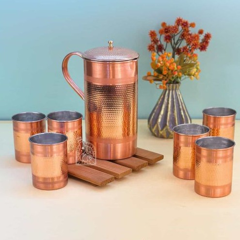 Посуда из меди издавна ценится на Востоке за практичность и особую эстетику. Медь долго сохраняет прохладу напитков, а со временем приобретает благородную патину, подчеркивающую ручную работу. Такой комплект станет эффектным элементом сервировки в доме, оформленном в этническом, винтажном или экостиле.