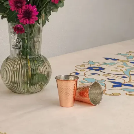 Комплект из шести медных стаканов, созданных вручную иранскими мастерами в лучших традициях восточного ремесла. Каждый стакан выполнен из чистой меди, а внутренняя поверхность покрыта безопасным слоем олова — это защищает металл, сохраняет вкус напитков и делает использование посуды полностью комфортным.