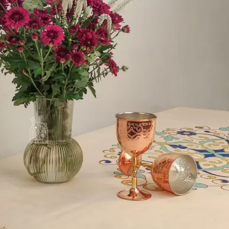 Элегантный медный кубок — изысканный предмет сервировки, в котором соединены традиции восточного ремесла и благородная лаконичность формы. Изделие выполнено вручную иранскими мастерами из чистой меди методом чеканки, благодаря чему поверхность имеет характерную фактуру с мягкими переливами света. Тонкая ножка из латуни придает кубку изящество и устойчивость, а классический силуэт напоминает старинные персидские сосуды для вина и прохладительных напитков. Кубок можно использовать как для подачи воды, сока, шербета и вина, так и в качестве декоративного элемента интерьера. Медь издавна ценится за природные антибактериальные свойства и способность дольше сохранять свежесть напитков. Такой предмет станет атмосферным акцентом на праздничном столе, украсит чайную церемонию или послужит оригинальным подарком ценителю восточной культуры. Каждый кубок уникален: следы ручной работы делают изделие живым, теплым и неповторимым. Он гармонично сочетается с другой медной утварью, керамикой и текстилем в этническом стиле, создавая настроение старинного иранского дома. Преимущества: полностью ручная работа и традиционная техника чеканки; благородная медь с выразительной фактурой; удобная устойчивая ножка из латуни; подходит для напитков и декоративного использования; аутентичное изделие, созданное в Иране. Добавьте в дом частицу восточной эстетики — медный кубок наполнит любую трапезу особым шармом и теплом. Размер: 8 × 15,7 см