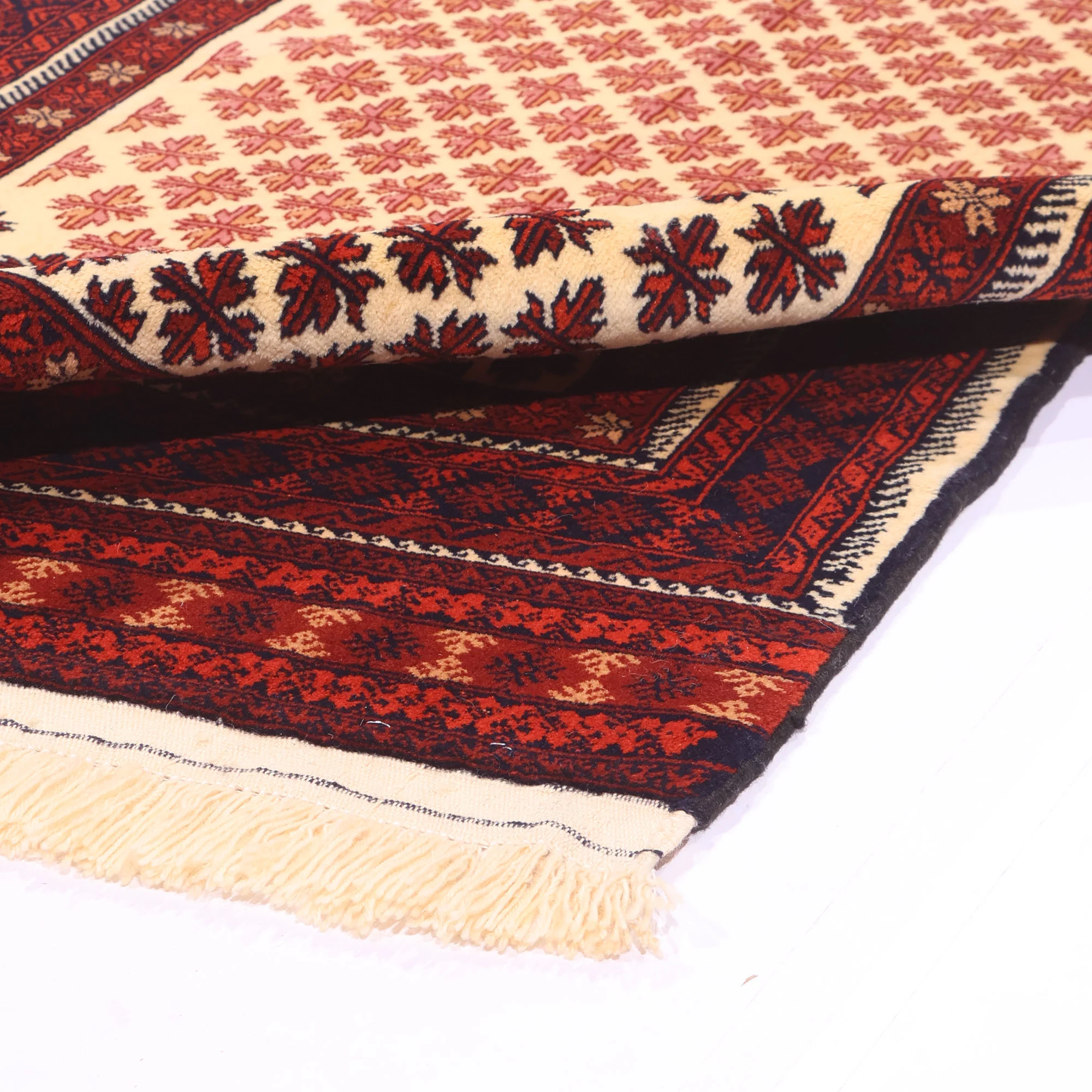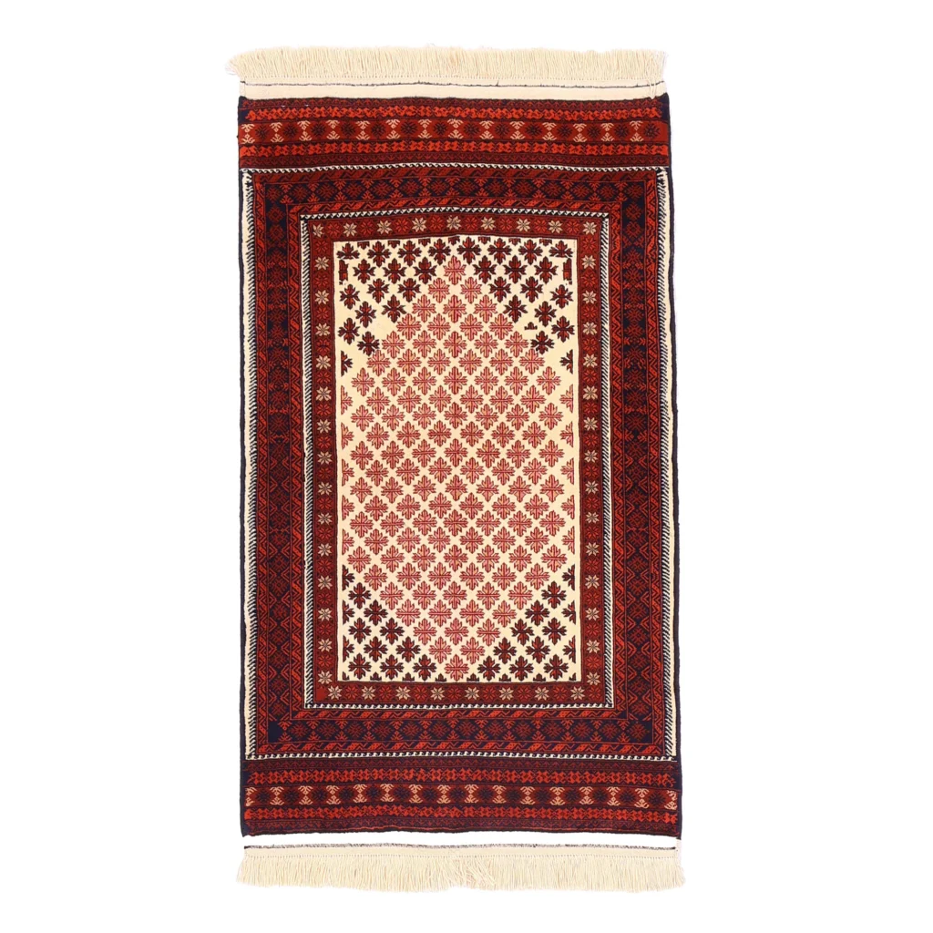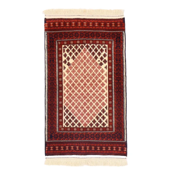 У белуджей почти всегда чувствуется строгость и собранность рисунка. Если кашкайские ковры часто звучат как живой дневник кочевой жизни — с более свободной композицией и фигуративными мотивами (животные, птицы, деревья), то белуджский орнамент обычно более “архитектурный” и графичный: повторяющиеся ромбы, ступенчатые формы, сетки, маленькие медальоны, ритмические “пульсации” узора. Ещё одно важное отличие — формат. Белуджские ковры нередко встречаются в сравнительно компактных размерах и в форматах, близких к молитвенным (с нишей-меһрабом), что исторически связано с бытом и мобильностью кочевого уклада.