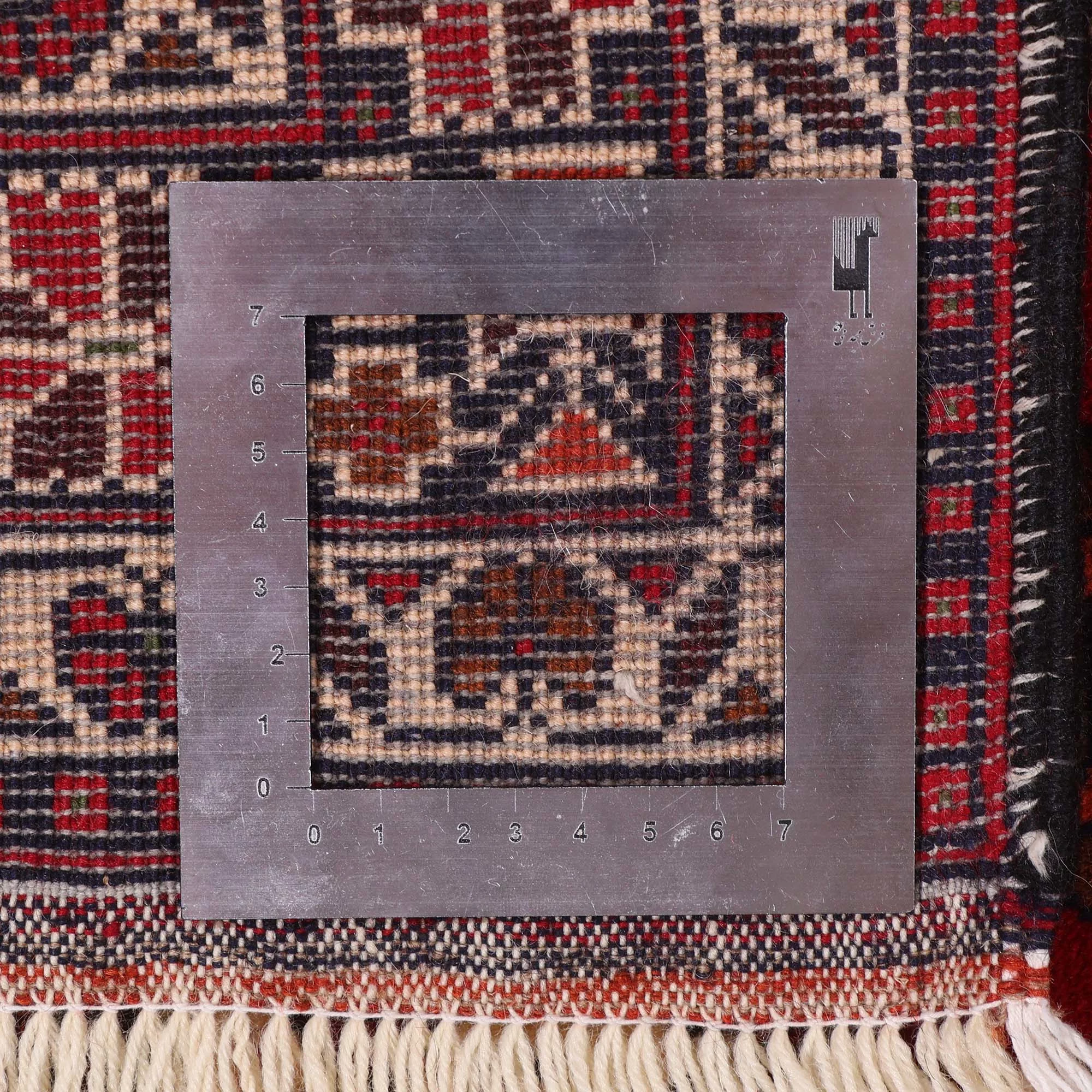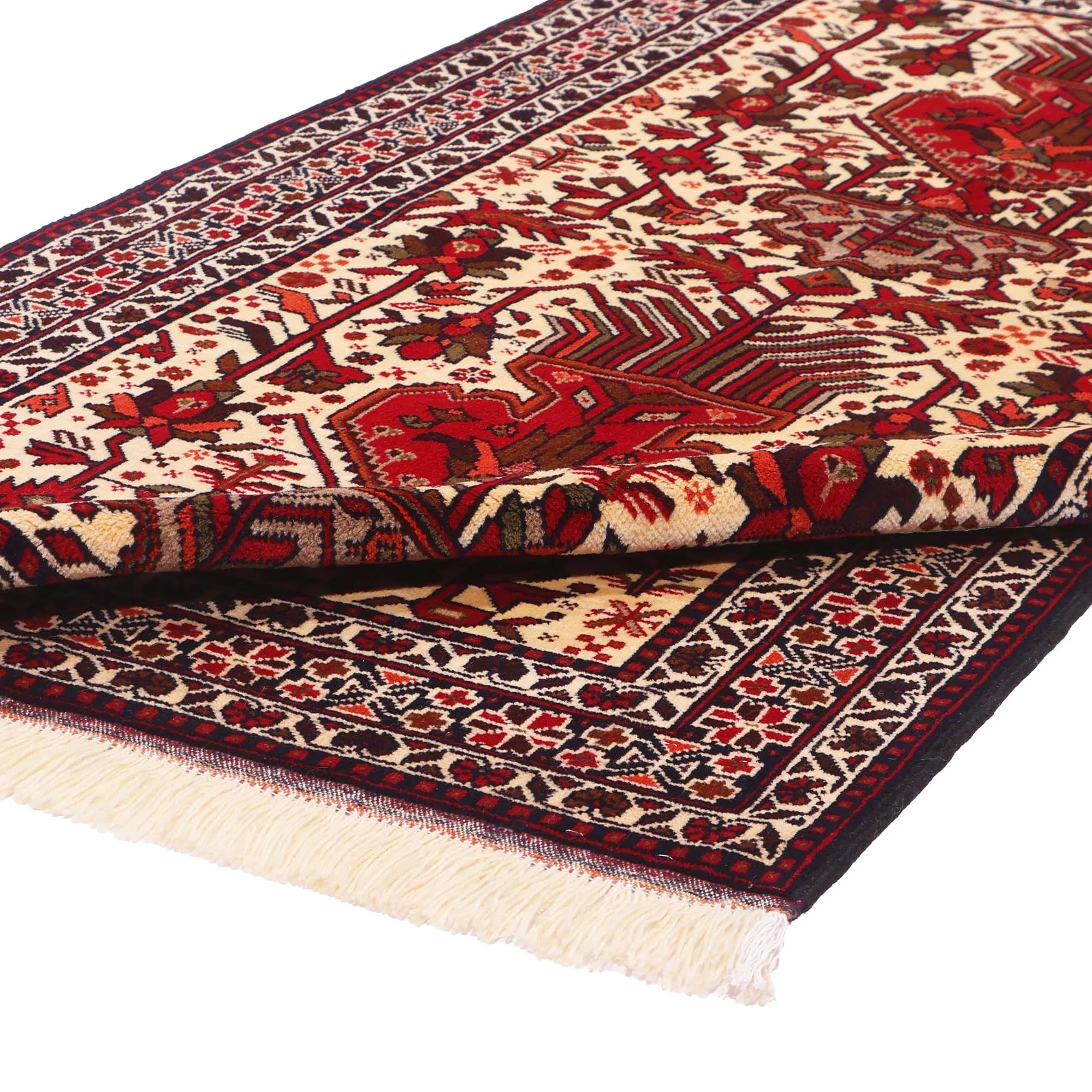 У белуджей почти всегда чувствуется строгость и собранность рисунка. Если кашкайские ковры часто звучат как живой дневник кочевой жизни — с более свободной композицией и фигуративными мотивами (животные, птицы, деревья), то белуджский орнамент обычно более “архитектурный” и графичный: повторяющиеся ромбы, ступенчатые формы, сетки, маленькие медальоны, ритмические “пульсации” узора. Ещё одно важное отличие — формат. Белуджские ковры нередко встречаются в сравнительно компактных размерах и в форматах, близких к молитвенным (с нишей-меһрабом), что исторически связано с бытом и мобильностью кочевого уклада.