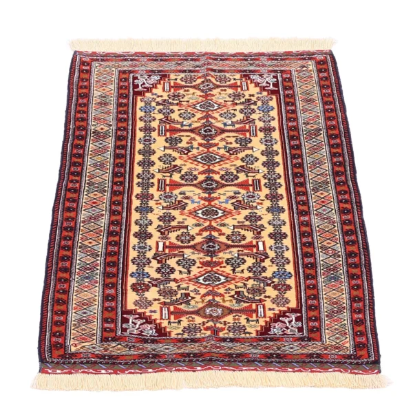 У белуджей почти всегда чувствуется строгость и собранность рисунка. Если кашкайские ковры часто звучат как живой дневник кочевой жизни — с более свободной композицией и фигуративными мотивами (животные, птицы, деревья), то белуджский орнамент обычно более “архитектурный” и графичный: повторяющиеся ромбы, ступенчатые формы, сетки, маленькие медальоны, ритмические “пульсации” узора. Ещё одно важное отличие — формат. Белуджские ковры нередко встречаются в сравнительно компактных размерах и в форматах, близких к молитвенным (с нишей-меһрабом), что исторически связано с бытом и мобильностью кочевого уклада.
