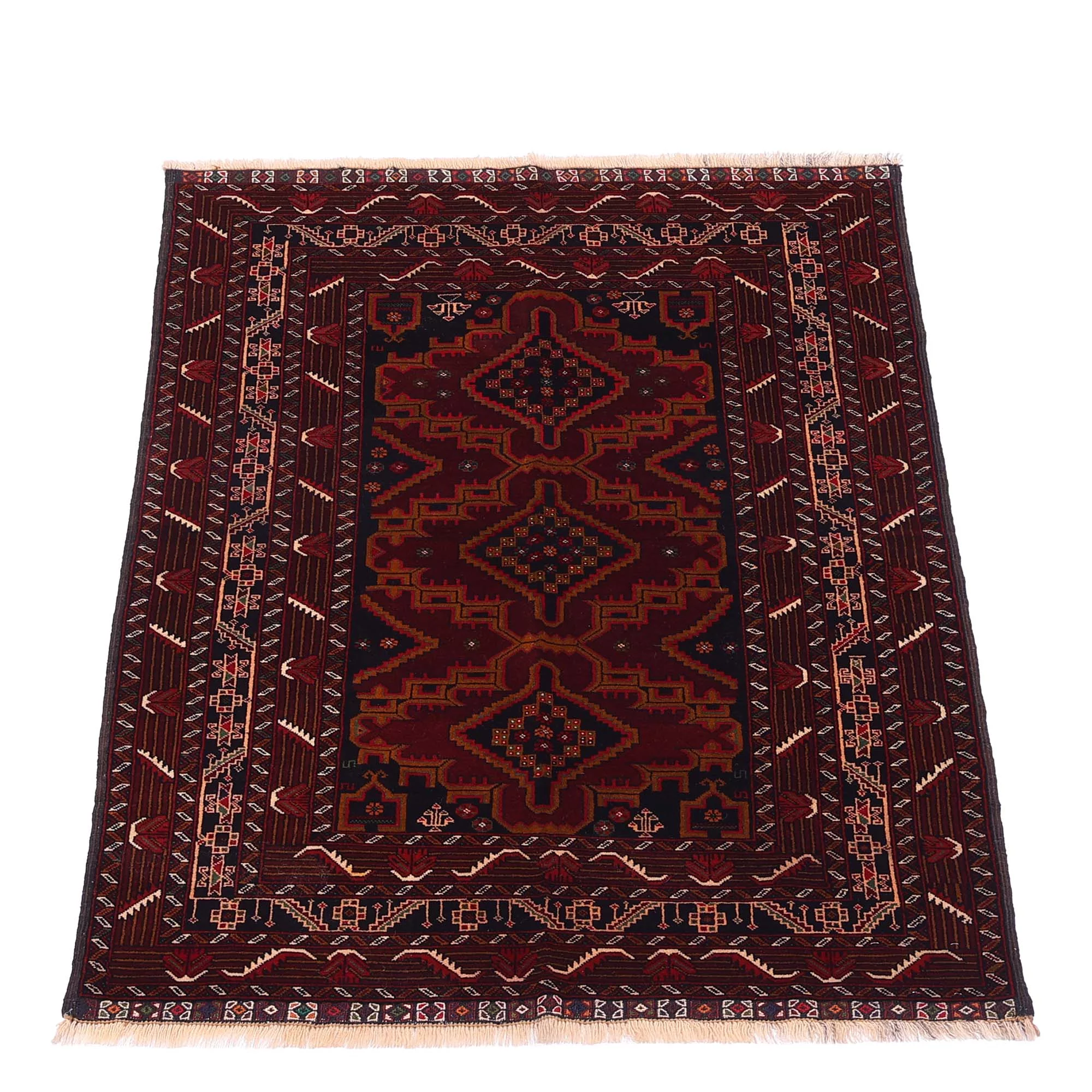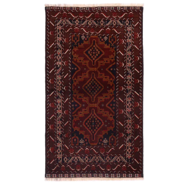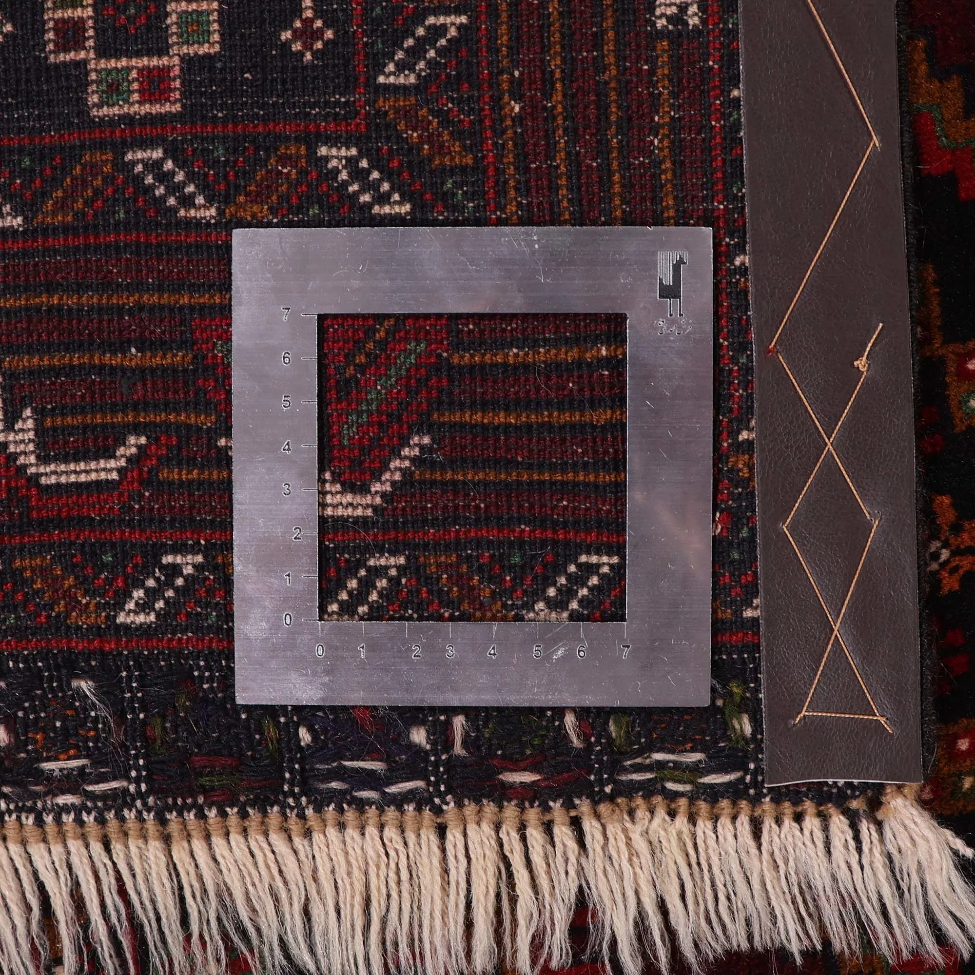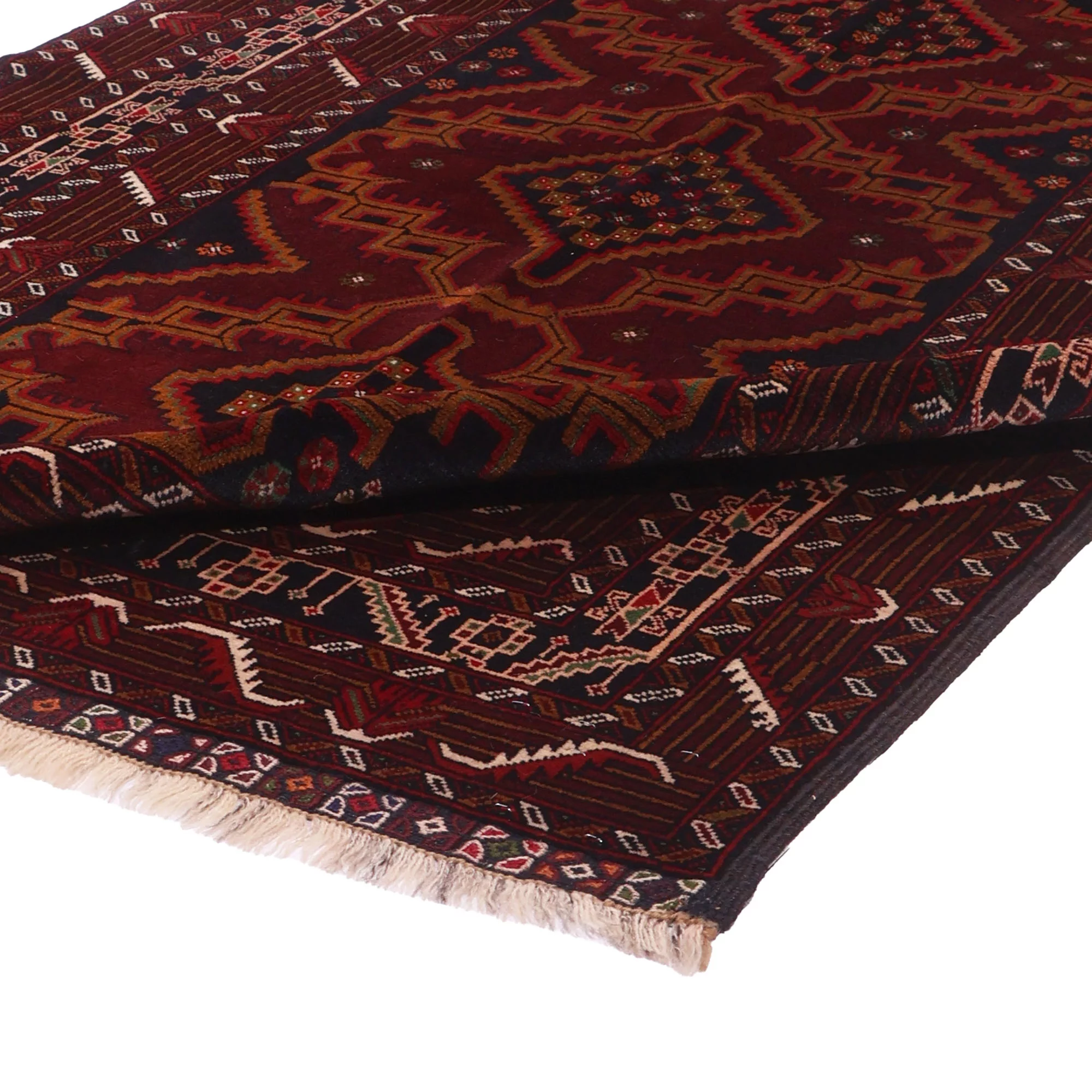 У белуджей почти всегда чувствуется строгость и собранность рисунка. Если кашкайские ковры часто звучат как живой дневник кочевой жизни — с более свободной композицией и фигуративными мотивами (животные, птицы, деревья), то белуджский орнамент обычно более “архитектурный” и графичный: повторяющиеся ромбы, ступенчатые формы, сетки, маленькие медальоны, ритмические “пульсации” узора. Ещё одно важное отличие — формат. Белуджские ковры нередко встречаются в сравнительно компактных размерах и в форматах, близких к молитвенным (с нишей-меһрабом), что исторически связано с бытом и мобильностью кочевого уклада.