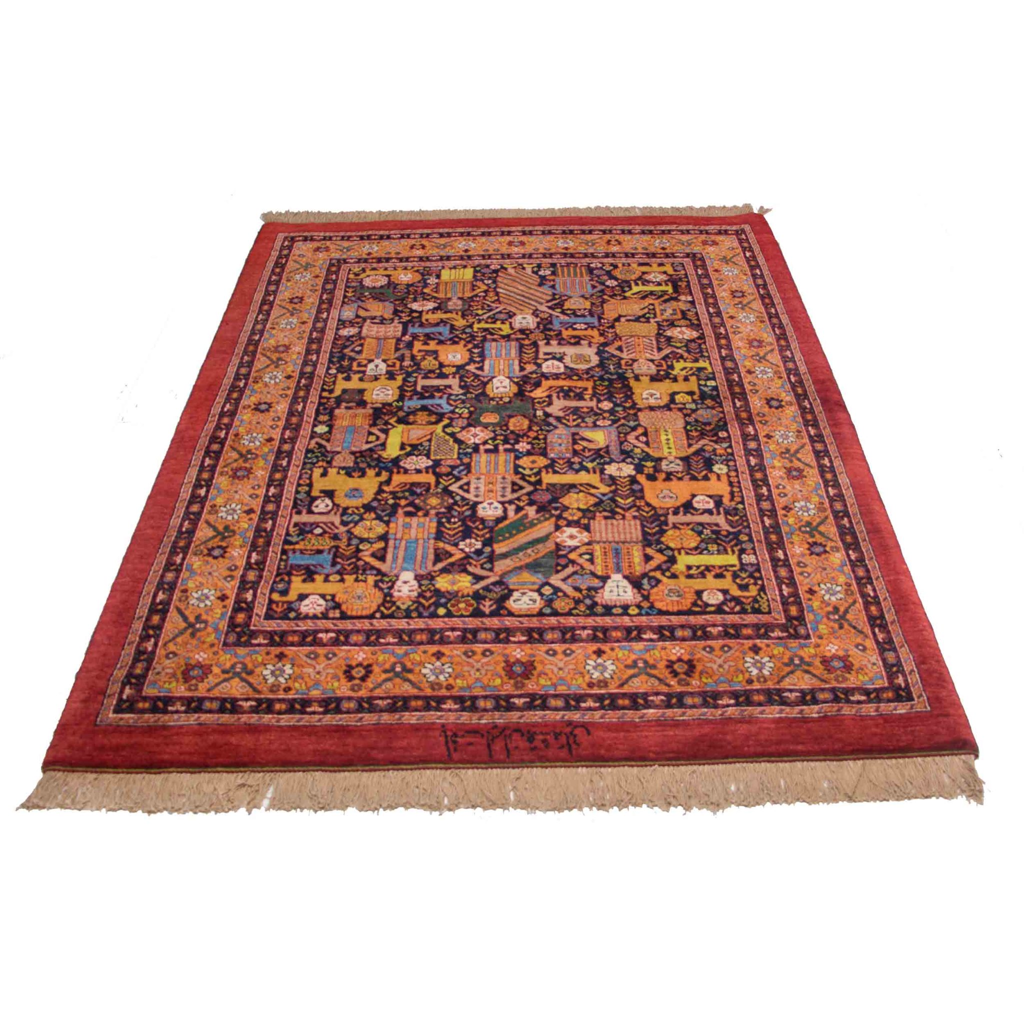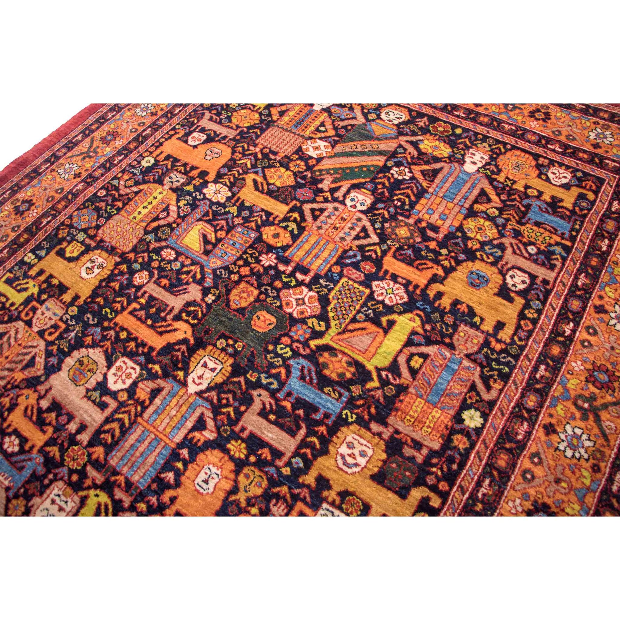 Кашкайские иранские ковры легко узнаваемы по своему художественному языку. В них часто встречаются: геометрические медальоны и ромбические структуры, стилизованные изображения животных и птиц, мотив «дерева жизни», ритмичные повторяющиеся элементы, создающие ощущение движения. В отличие от более строгих белуджских ковров или архитектурных Heriz, кашкайские изделия обладают большей пластикой и живостью. Орнамент может казаться слегка наивным — и именно в этом его сила. Это ручная работа в чистом виде, где каждая линия отражает индивидуальность мастера.