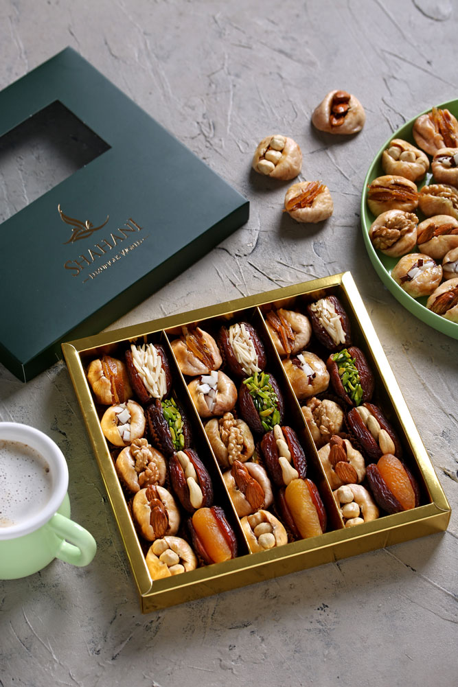 Подарочный набор фиников и сухофруктов Shahani Yashmi Pack — это большой и насыщенный десерт из отборных меджул-фиников и инжира с разнообразными начинками, собранный в презентабельную подарочную упаковку. Этот набор сухофруктов и фиников сочетает фруктовую сладость и богатство текстур, делая его идеальным подарком на праздник, торжество или семейный вечер. Этот подарочный набор орехов и сухофруктов включает: