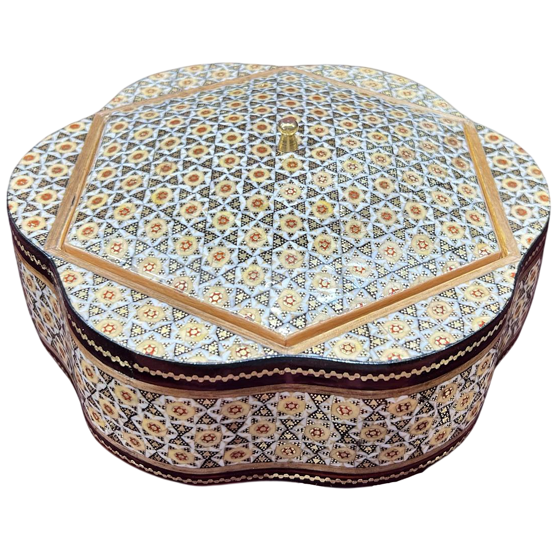 Эта шкатулка — настоящий пример искусства хатамкари / хатам кари, одного из самых изысканных народных промыслов Ирана. Созданная вручную в городе Исфахан, она сочетает мастерство, традицию и утонченный дизайн, превращая каждую деталь в живую историю.