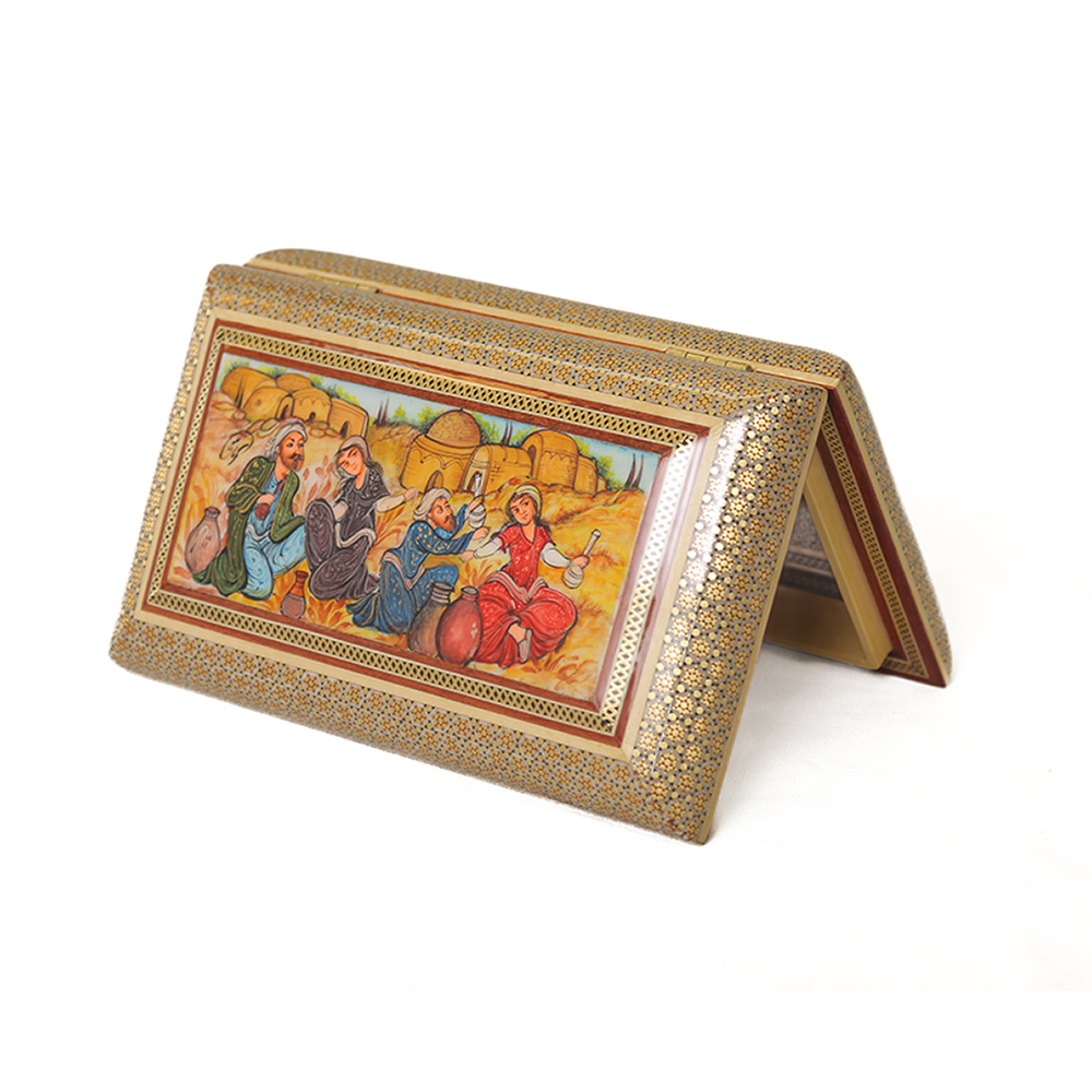 Эта шкатулка — настоящий пример искусства хатамкари / хатам кари, одного из самых изысканных народных промыслов Ирана. Созданная вручную в городе Исфахан, она сочетает мастерство, традицию и утонченный дизайн, превращая каждую деталь в живую историю.