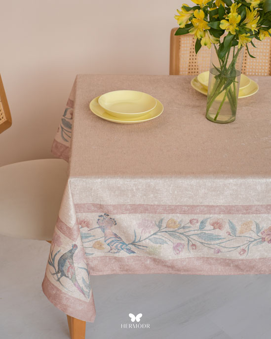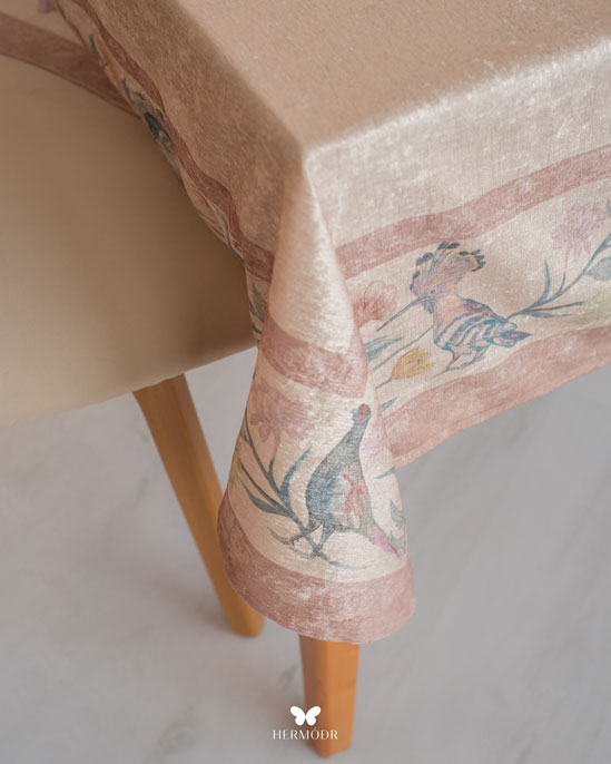 Скатерть выполнена из шелковистого бархата: она мягкая на ощупь, устойчива к выцветанию и сохраняет форму после стирок. Материал подходит для регулярного использования и не требует сложного ухода. Скатерть защищает поверхность стола и одновременно выполняет декоративную функцию — её можно использовать отдельно или сочетать с раннером и посудой.