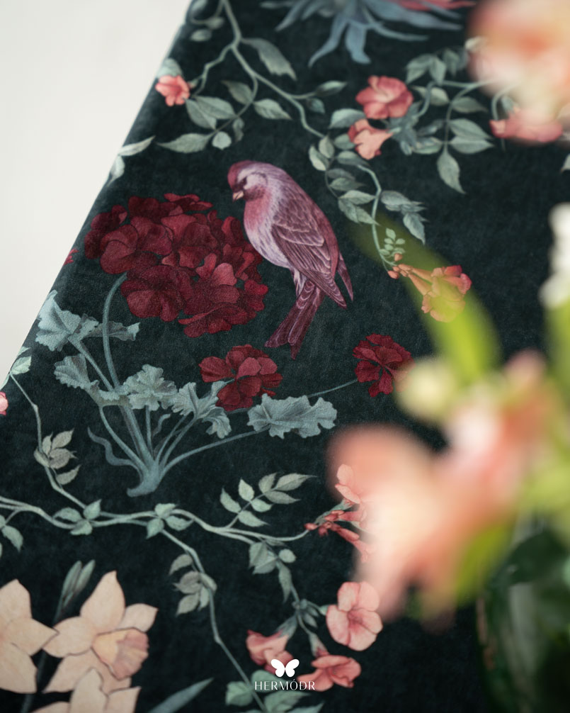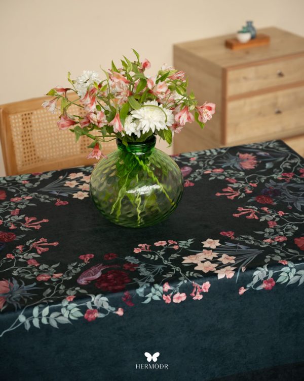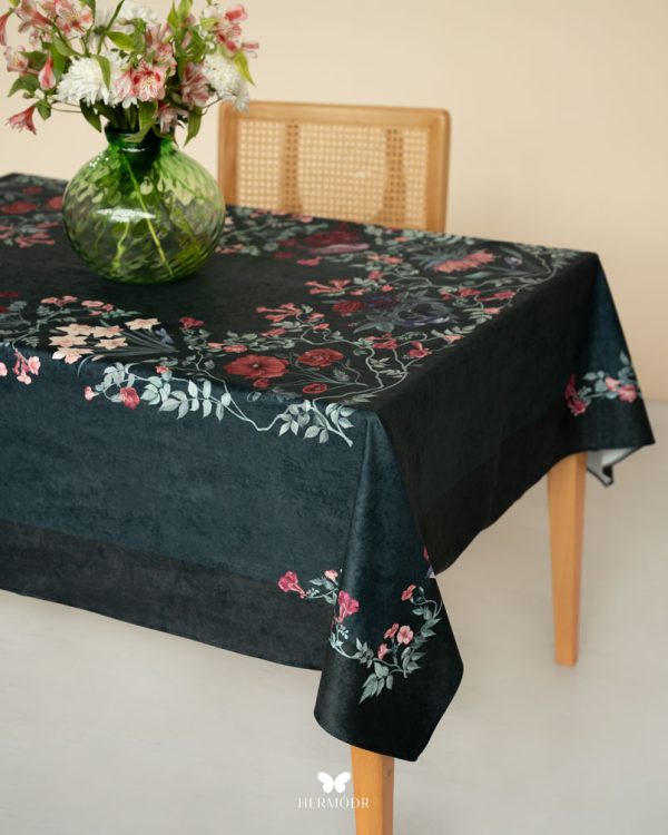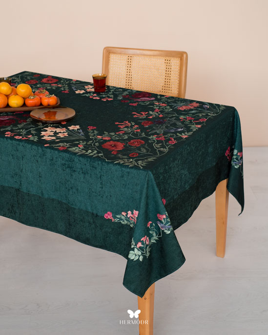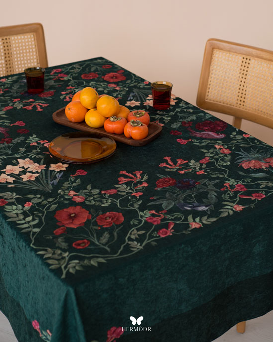 Скатерть выполнена из шелковистого бархата: она мягкая на ощупь, устойчива к выцветанию и сохраняет форму после стирок. Материал подходит для регулярного использования и не требует сложного ухода. Скатерть защищает поверхность стола и одновременно выполняет декоративную функцию — её можно использовать отдельно или сочетать с раннером и посудой.