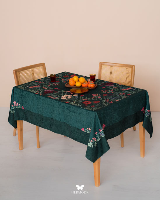 Иранская бархатистая скатерть Bazm создаёт аккуратную и праздничную сервировку стола. Бархатная поверхность придаёт интерьеру ощущение уюта и делает стол центральным элементом обеденной зоны — как в повседневной жизни, так и во время приёма гостей.