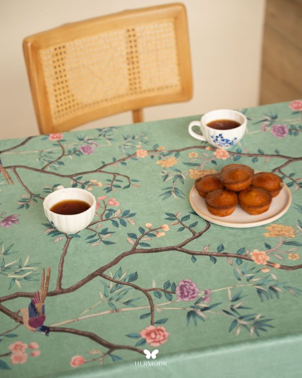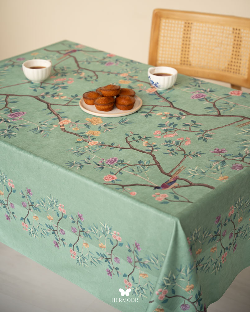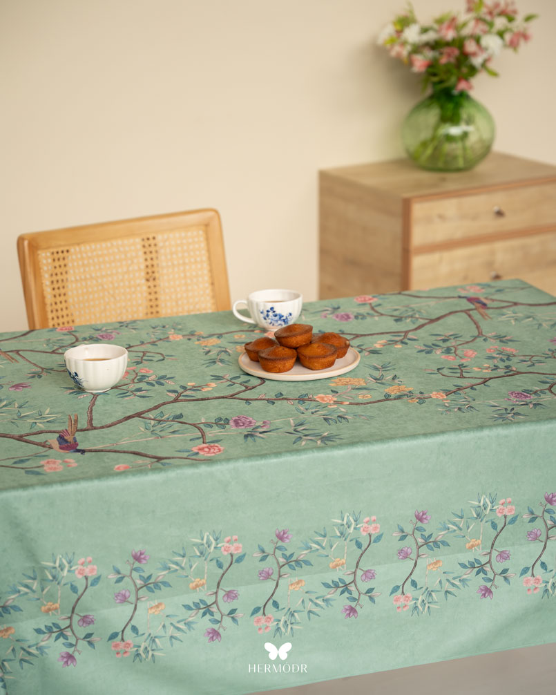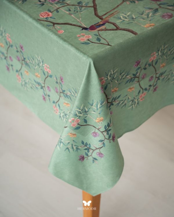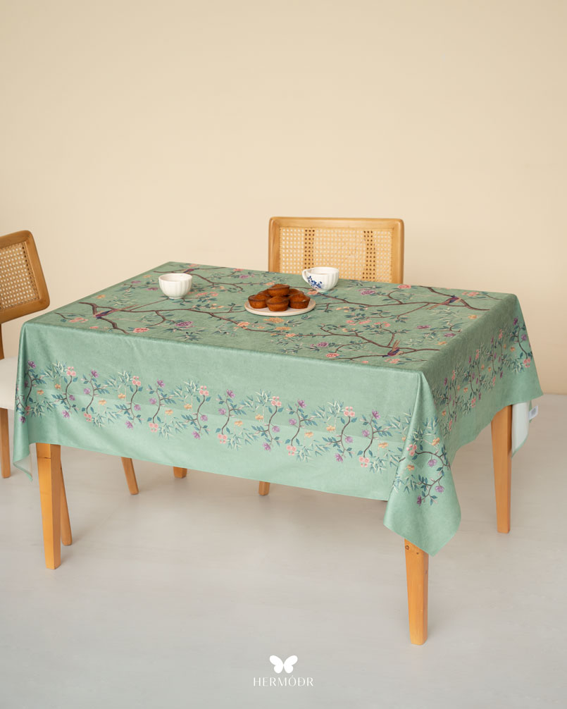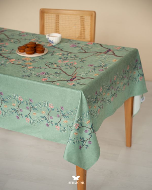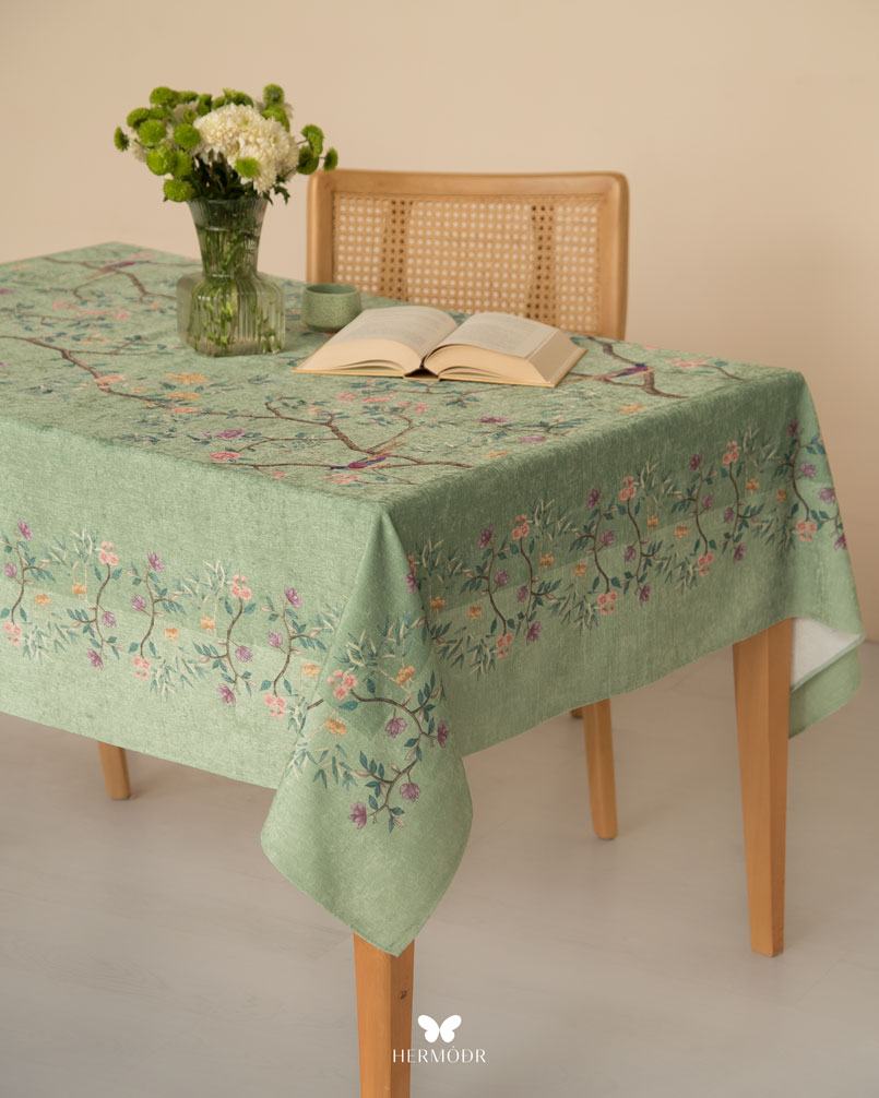 Скатерть выполнена из шелковистого бархата: она мягкая на ощупь, устойчива к выцветанию и сохраняет форму после стирок. Материал подходит для регулярного использования и не требует сложного ухода. Скатерть защищает поверхность стола и одновременно выполняет декоративную функцию — её можно использовать отдельно или сочетать с дорожкой и посудой.