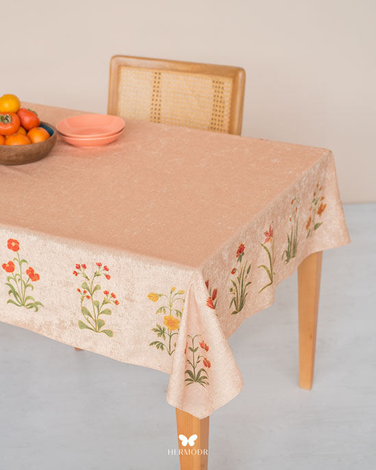 Скатерть выполнена из шелковистого бархата: она мягкая на ощупь, устойчива к выцветанию и сохраняет форму после стирок. Материал подходит для регулярного использования и не требует сложного ухода. Скатерть защищает поверхность стола и одновременно выполняет декоративную функцию — её можно использовать отдельно или сочетать с раннером и посудой.