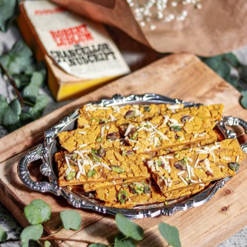 Этот иранский сохан отличается более плотной и влажной структурой. В отличие от круглых пластов, здесь используются мелко дроблёные фисташки и миндаль, равномерно распределённые внутри. По форме он напоминает восточную баклаву, что делает текстуру более насыщенной.Ореховый вкус с карамельной глубиной