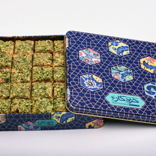 Этот иранский сохан отличается более плотной и влажной структурой. В отличие от круглых пластов, здесь используются мелко дроблёные фисташки и миндаль, равномерно распределённые внутри. По форме он напоминает восточную баклаву, что делает текстуру более насыщенной.Ореховый вкус с карамельной глубиной